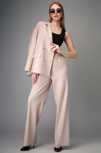 Пиджак костюма — свободный с прямым кроем, двубортный и с подкладкой, акцентирован крупными пуговицами с эффектом под дерево. Карманы добавляют функциональности и стильности. Широкие брюки палаццо с высокой талией, поясом на резинке и карманами создают выгодный силуэт, позволяя сохранять ультрасовременный вид не теряя в удобствах.