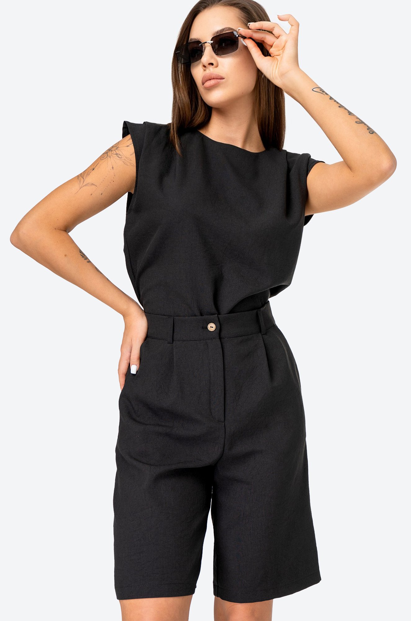 Блузка без рукава, прямого кроя, с эффектными складками на плечах, аккуратная застежка по спинке. Шорты-бермуды комфортной длины, с небольшими защипами с двух сторон, которые делают посадку более свободной. Широкий пояс со шлевками предполагает использование ремня, застежка на молнию и пуговицу, по бокам расположены удобные карманы.