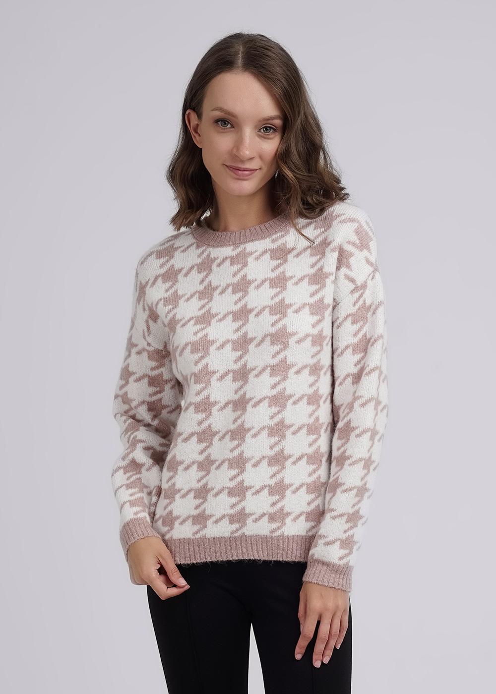 Вязаный джемпер жаккардового переплетения - гусиная лапка. Спущенная линия плеча. Округлая горловина,по горловине бейка. Манжет и пояс вывязаны ластиком.
