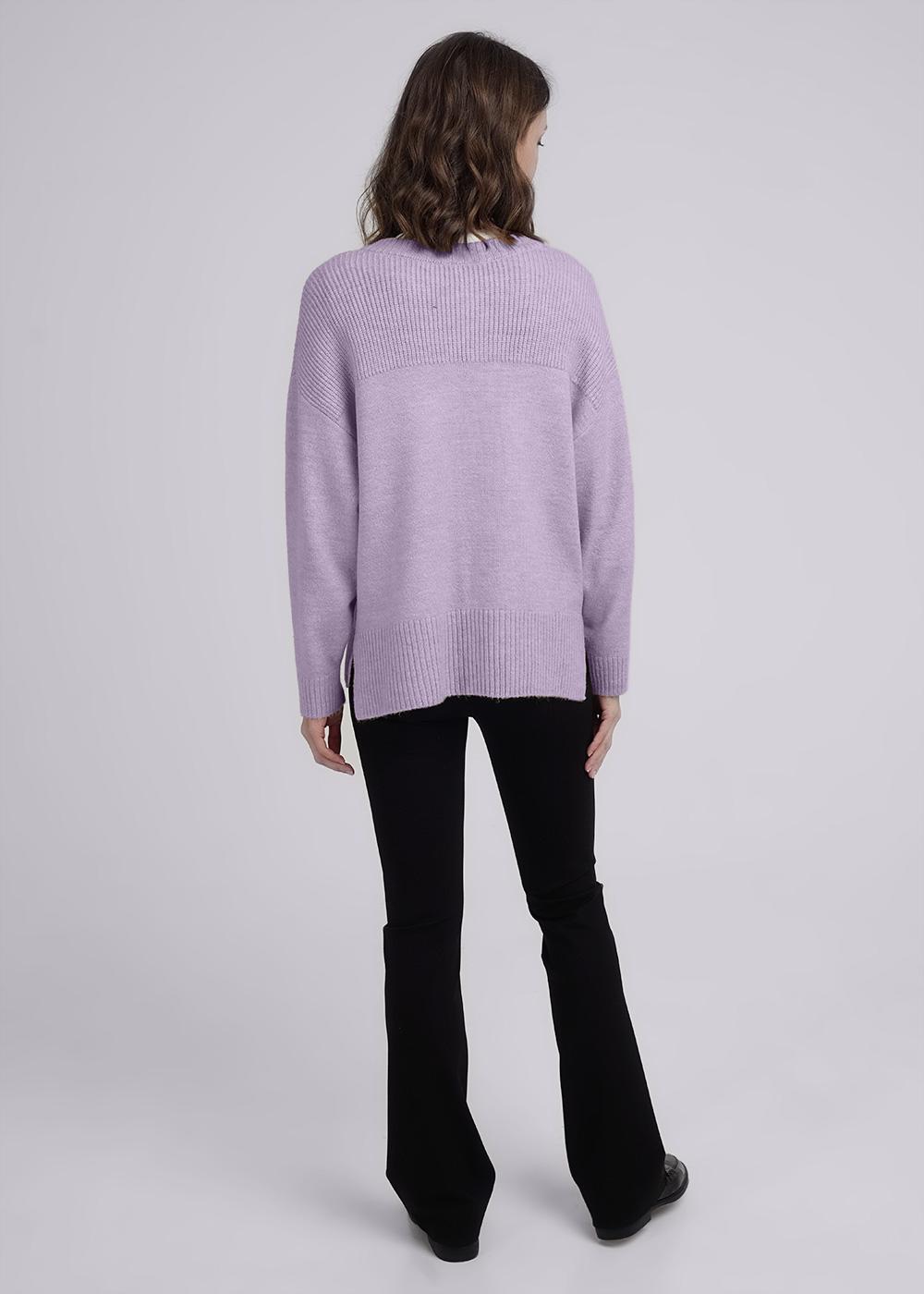 Вязаный жакет умеренного объема,средней длины из акриловой пряжи с застежкой на пуговицы. V -образная грловина. Спущенная линия плеча. По бокам разрезы.