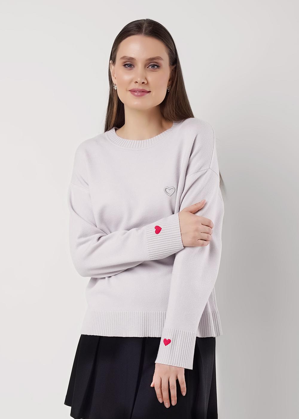 Вязаный джемпер свободного силуэта из вискозной пряжи с добавлением нейлона. Основное переплетение плотная гладь. Округлая горловина с бейкой. Длинный втачной рукав. По низу изделия и рукава манжет. Спереди и по низу рукавов вышивка.