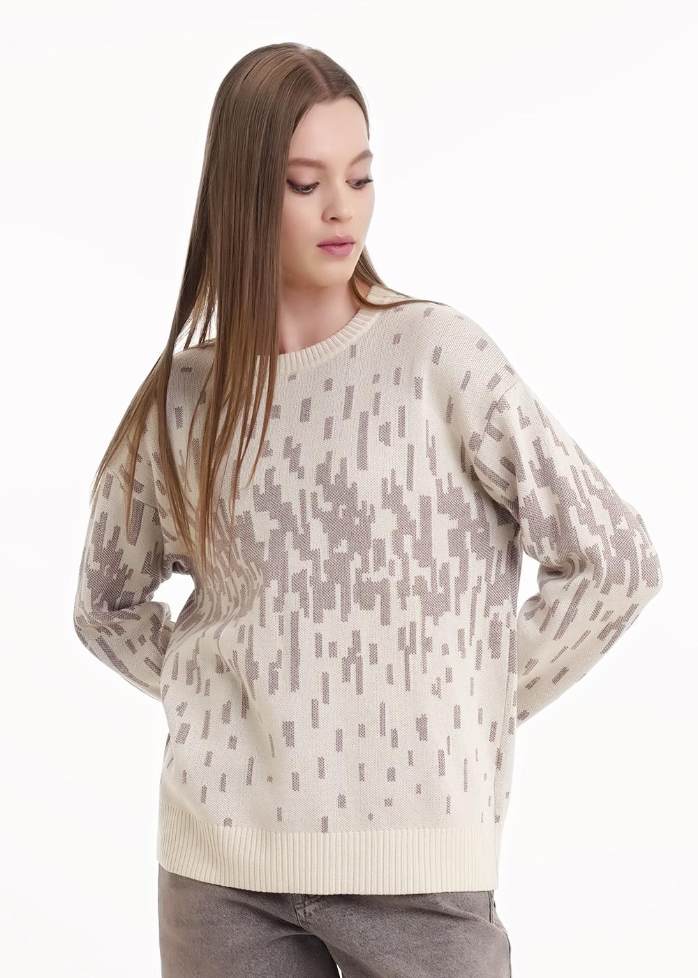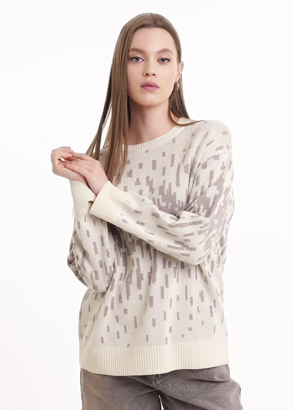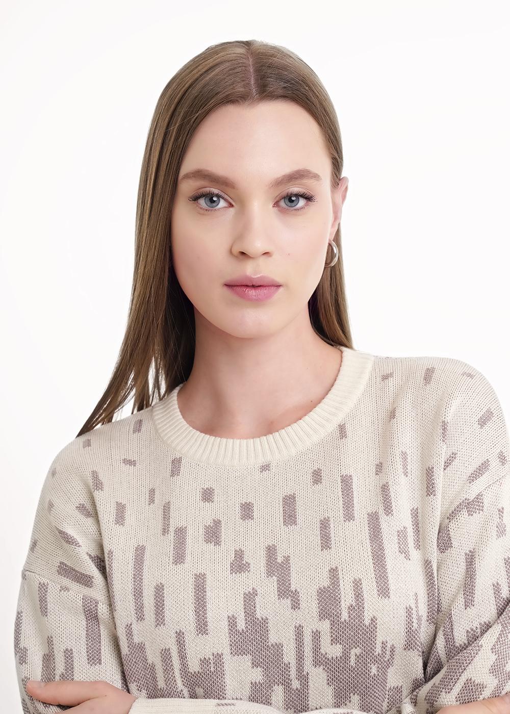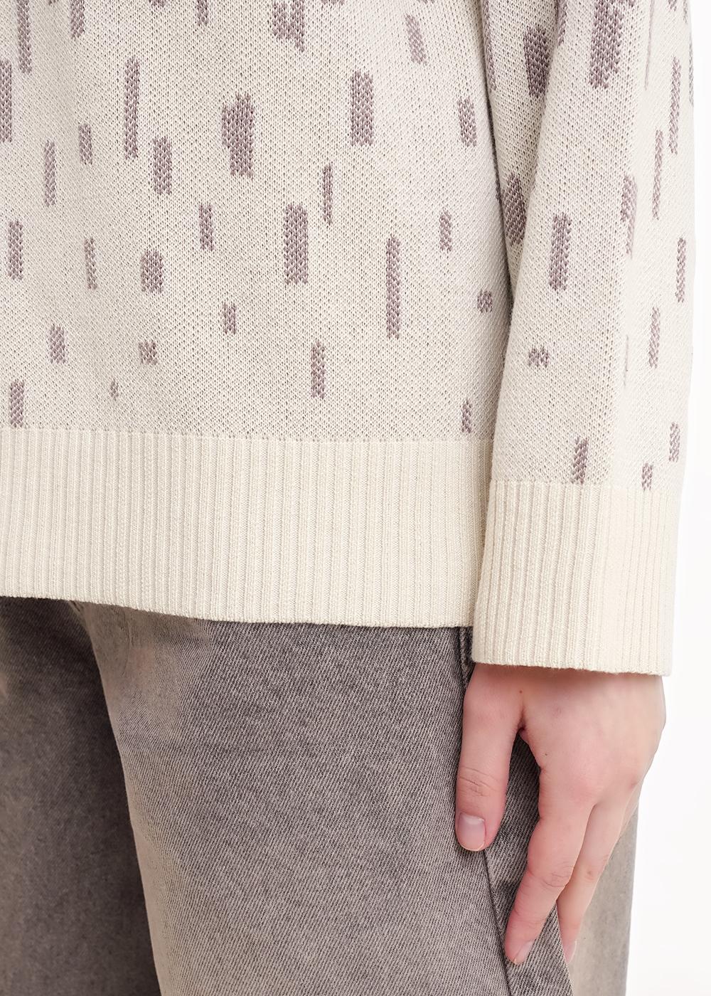 Вязаный джемпер прямого силуэта, жаккардового переплетения из хлопковой пряжи с добавлением акрила. Длинный рукав со спущенной линией плеча. Округлая горловина с бейкой. По низу изделия и рукавов манжеты.