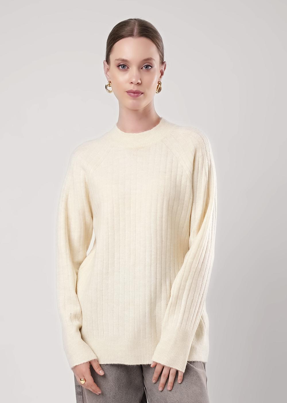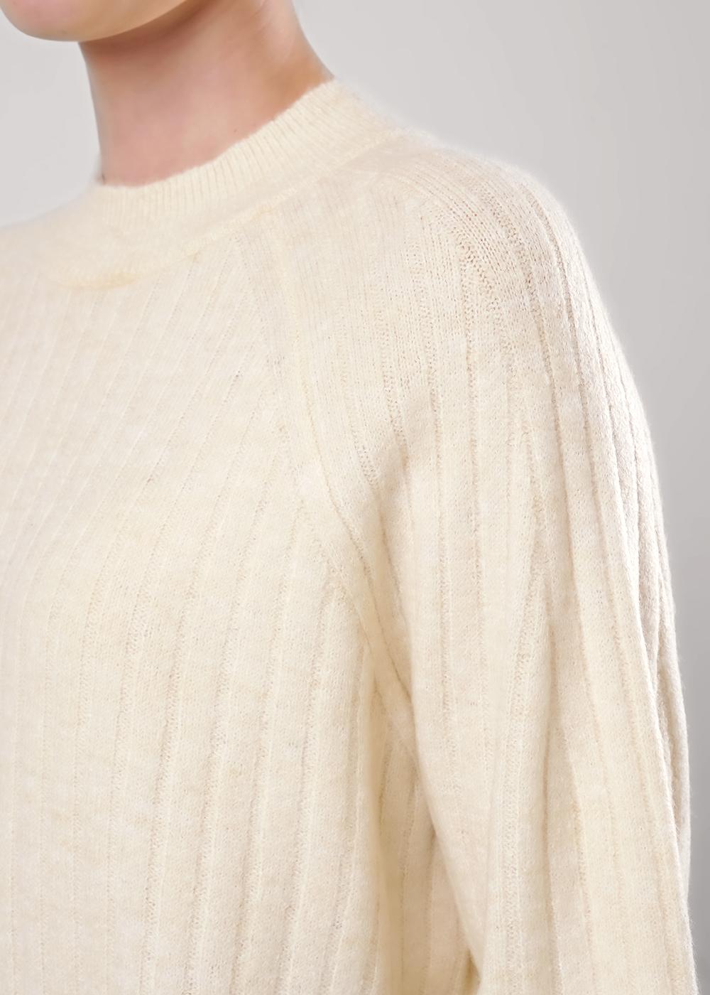Вязаный джемпер из акриловой пряжи, ластичного переплетения. Длинный рукав реглан. По низу рукава и изделия манжеты. Округлая горловина с бейкой.
