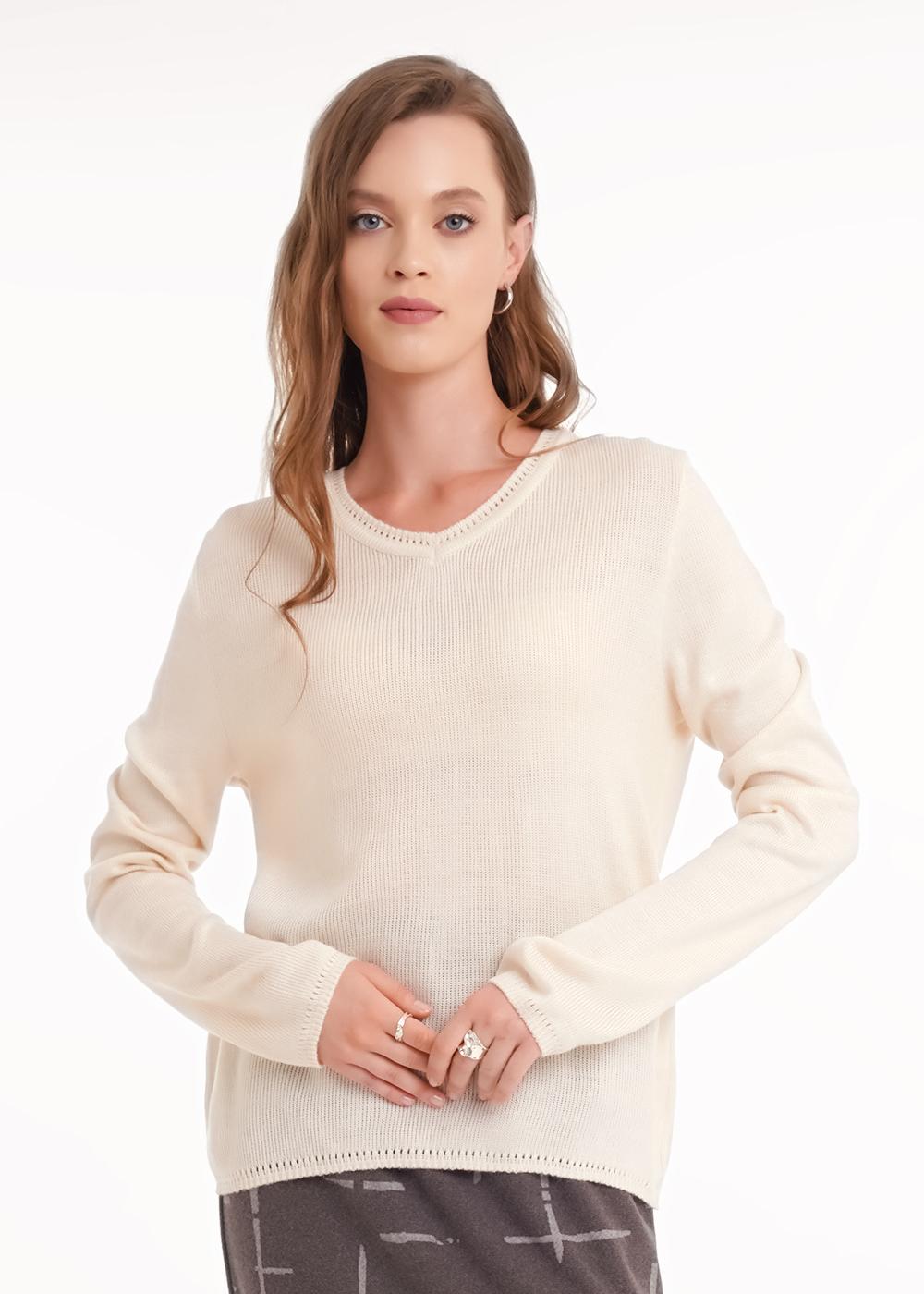 Вязаный джемпер прямого силуэта из акриловой пряжи, переплетения гладь. Длинный втачной рукав. V-образный вырез горловины. По горловине,низу рукава и изделия ажурный рулик.