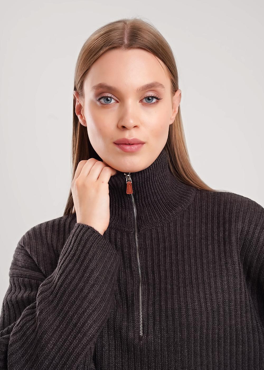 Вязаный джемпер умеренного объема из акриловой пряжи с добавлением шерсти, переплетения полуфанг. Спущенный длинный рукав. По горловине стойка с застежкой на молнию.