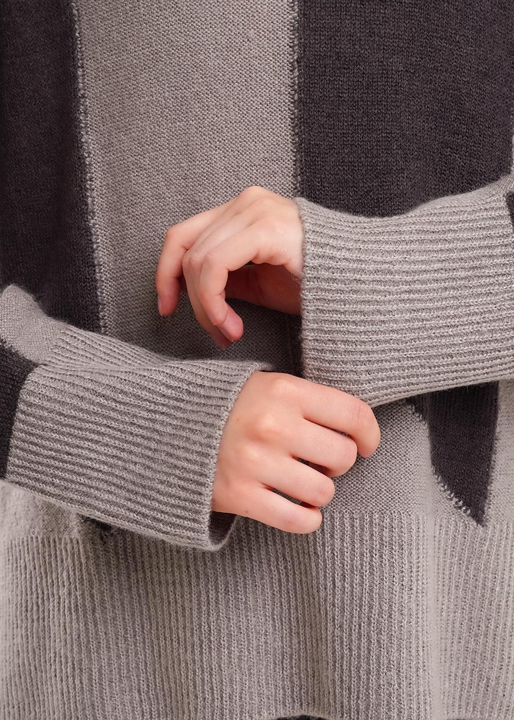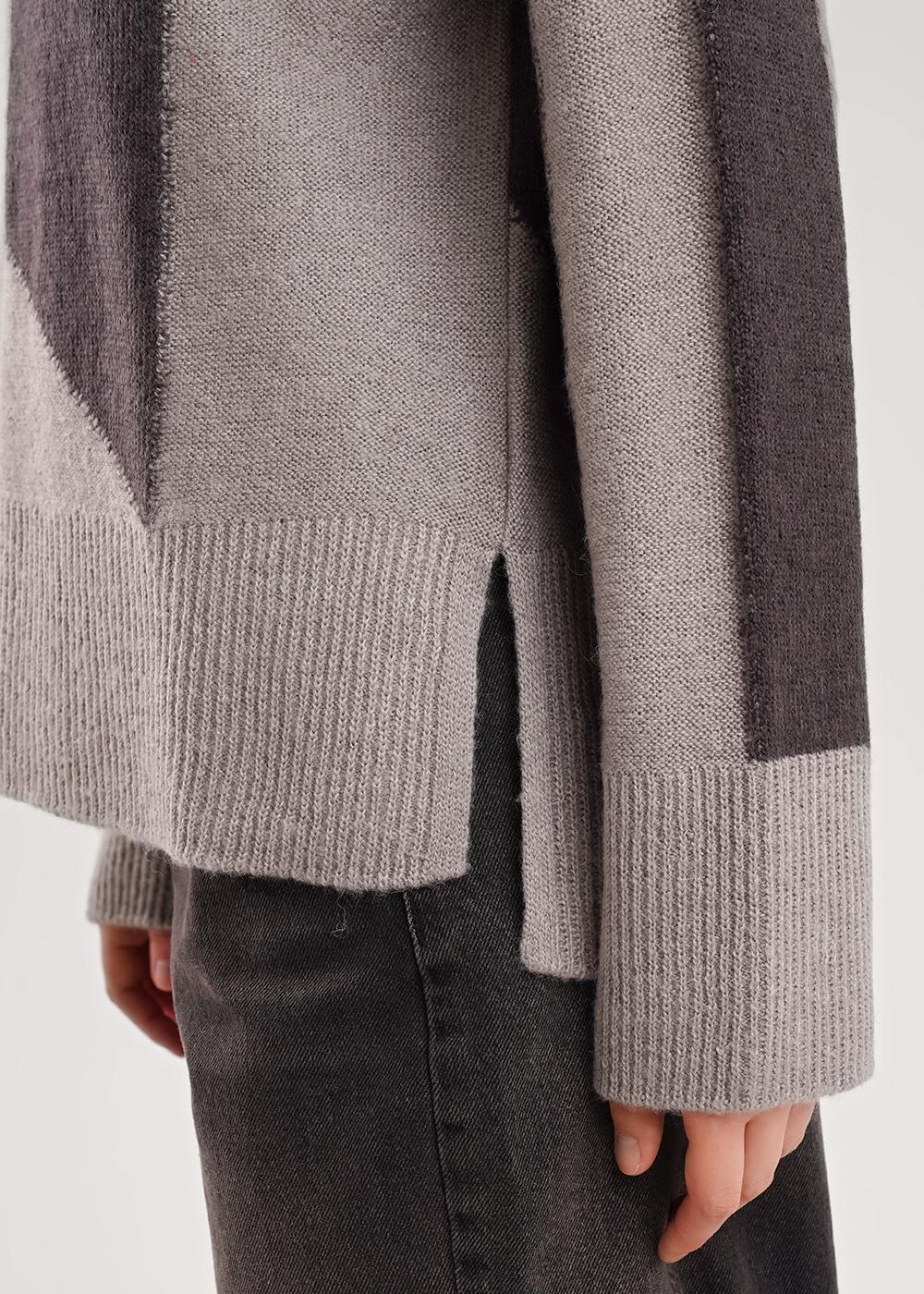 Вязаный джемпер умеренного объема из акриловой пряжи с добавлением шерсти, переплетение гладь (изнаночные петли). Спущенный длинный рукав, округлая горловина с бейкой. По низу изделия и рукавов широкие манжеты. По бокам разрезы.