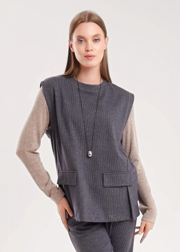 Вязаный джемпер умеренного объема из акриловой пряжи с добавлением шерсти, переплетение гладь (изнаночные петли). Спущенный длинный рукав, округлая горловина с бейкой. По низу изделия и рукавов широкие манжеты. По бокам разрезы.
