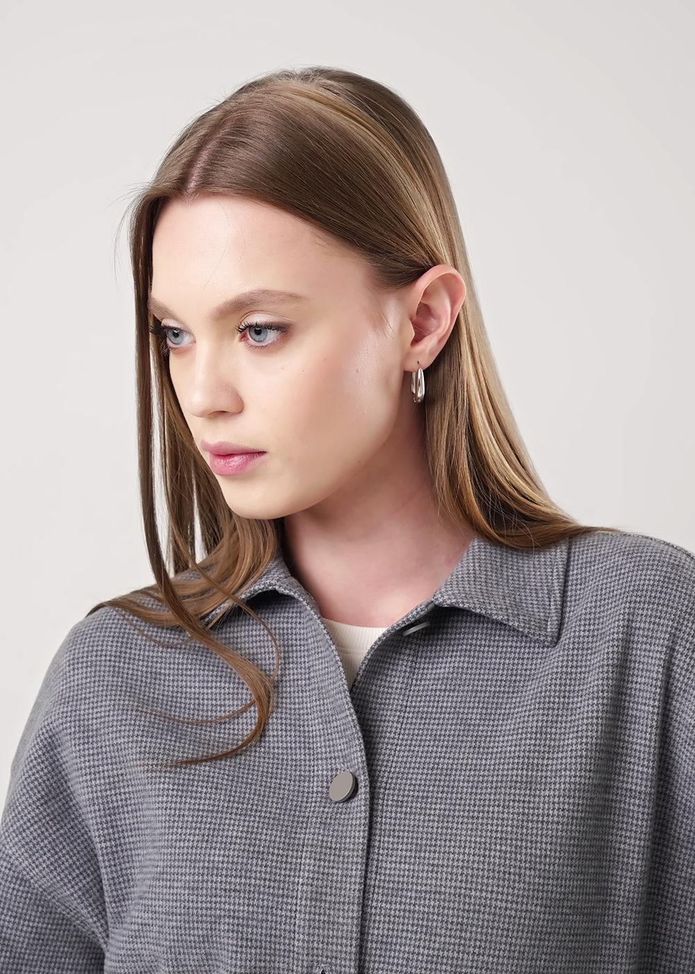 Куртка прямого силуэта из трикотажного полотна джерси. Отложной воротник на стойке. По переду планка с застежкой на пуговицы, на спинке кокетка с бантовой складкой. Длинный рукав со спущенной линией плеча, внизу манжет на пуговице. Фигурный низ изделия.