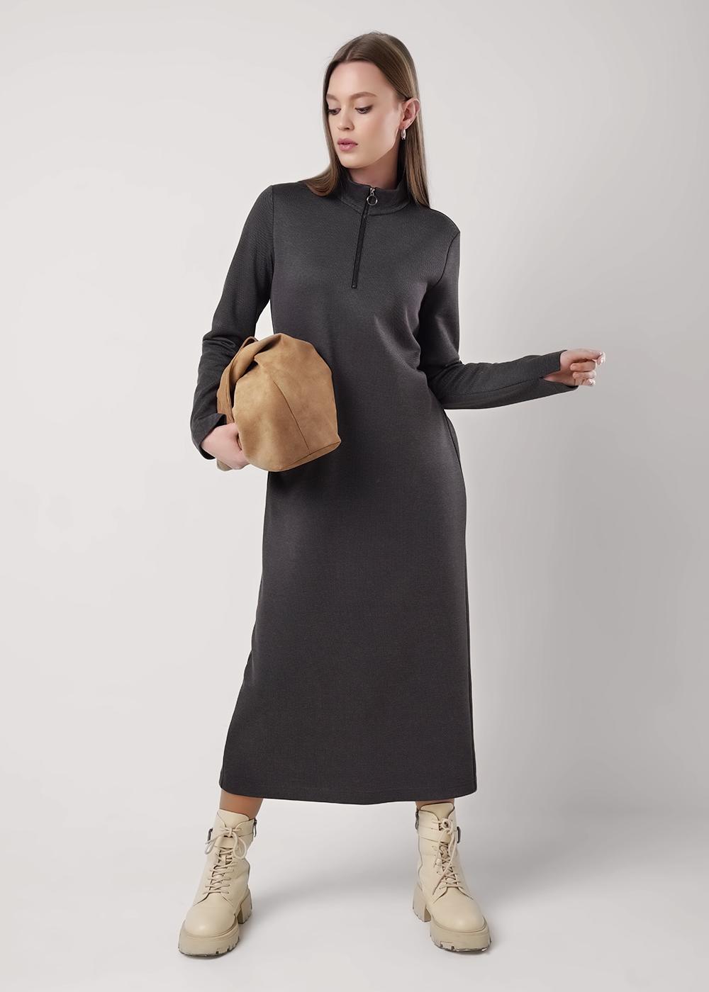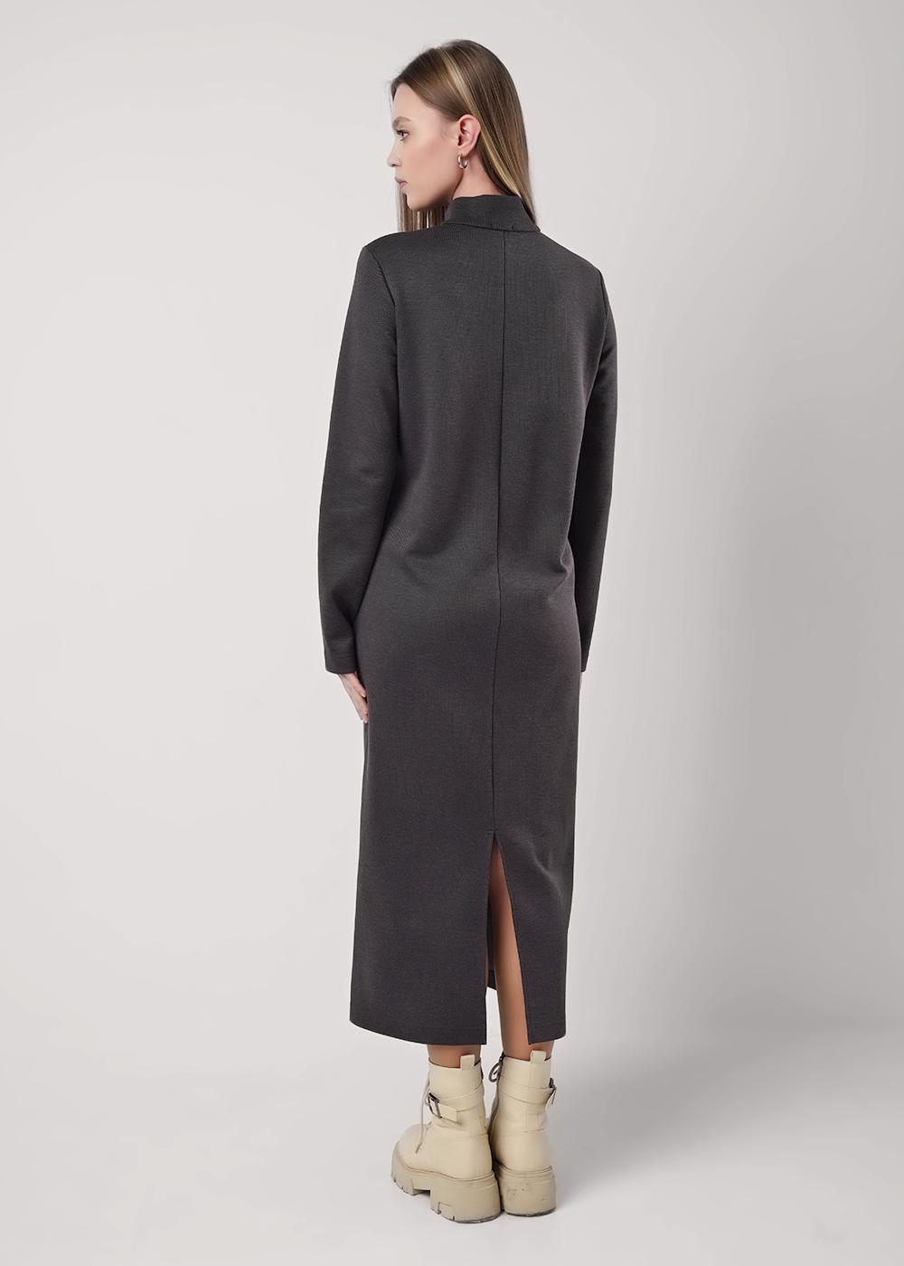 Платье из трикотажного полотна интерлок жаккард, прямого силуэта длиной ниже колена. По горловине стойка, спереди на молниии. Длинный втачной рукав. По спинке средний шов, внизу разрез.