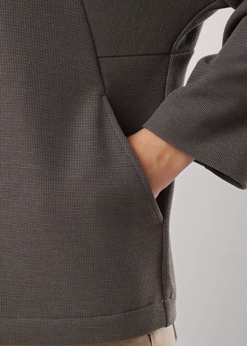 Джемпер свободного кроя из поливискозного трикотажного полотна. Длинный рукав-реглан. Округлая горловина с потайной обтачкой. По спинке потайная молния. По переду вертикальные резы с карманами в шве. Спереди вышивка.