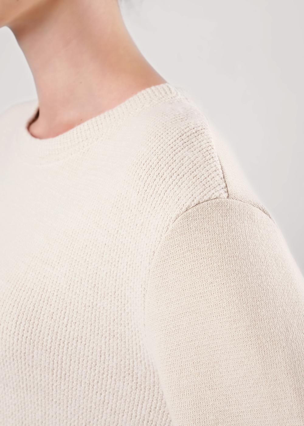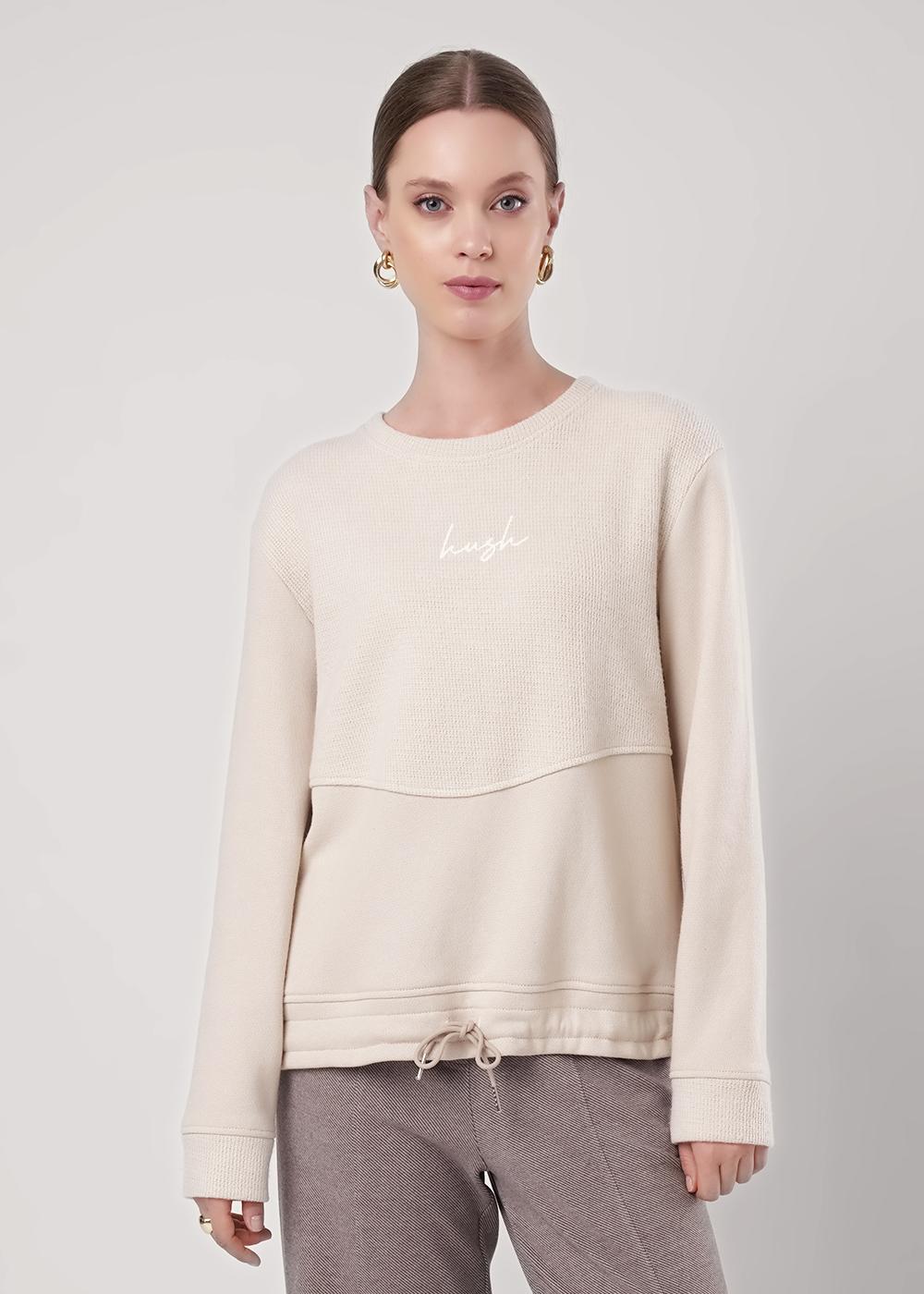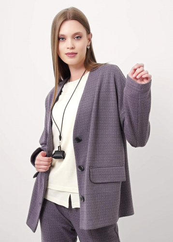Джемпер из трикотажного полотна вискоза вязанная. Округлая горловина с обтачкой. Перед комбинированный (лицо,изнанка) фигурный рез. Втачной длинный рукав, внизу манжет (изнанка ворс). По низу изделия манжет со шнуром. Спереди вышивка.