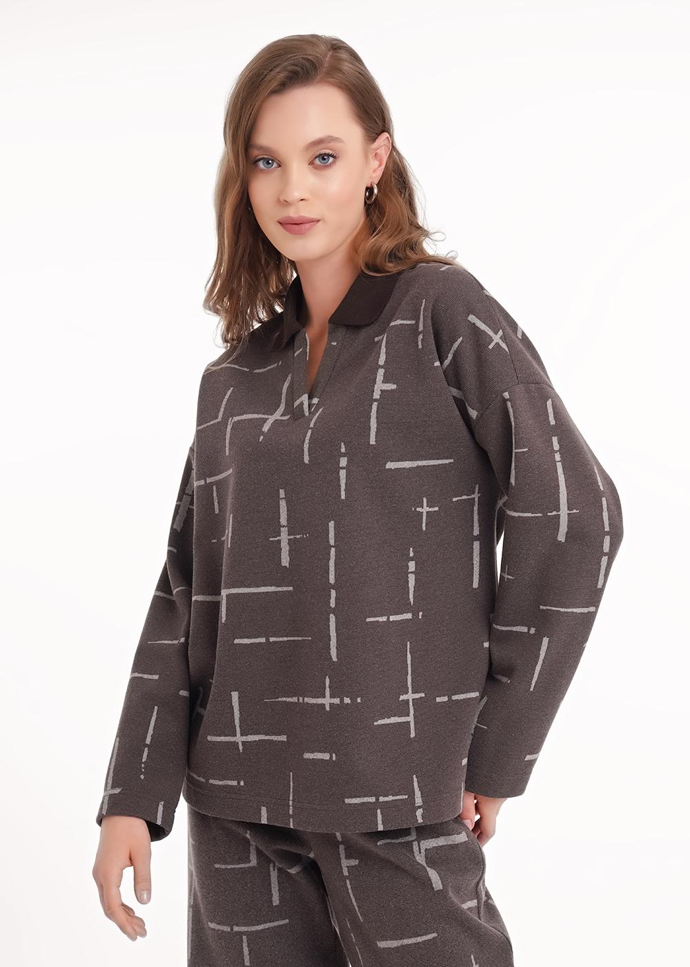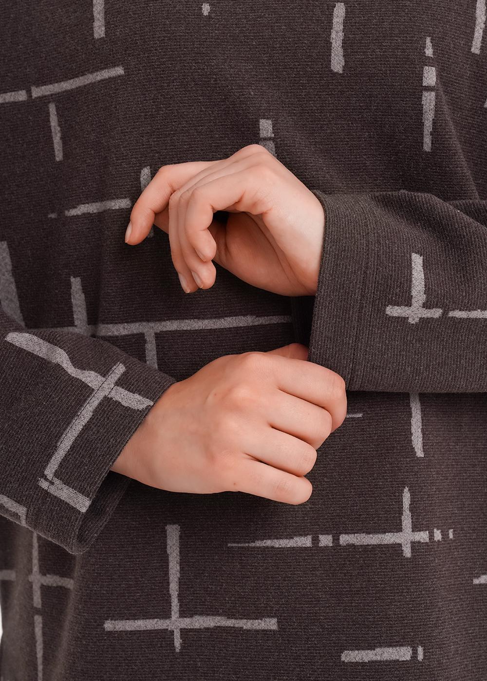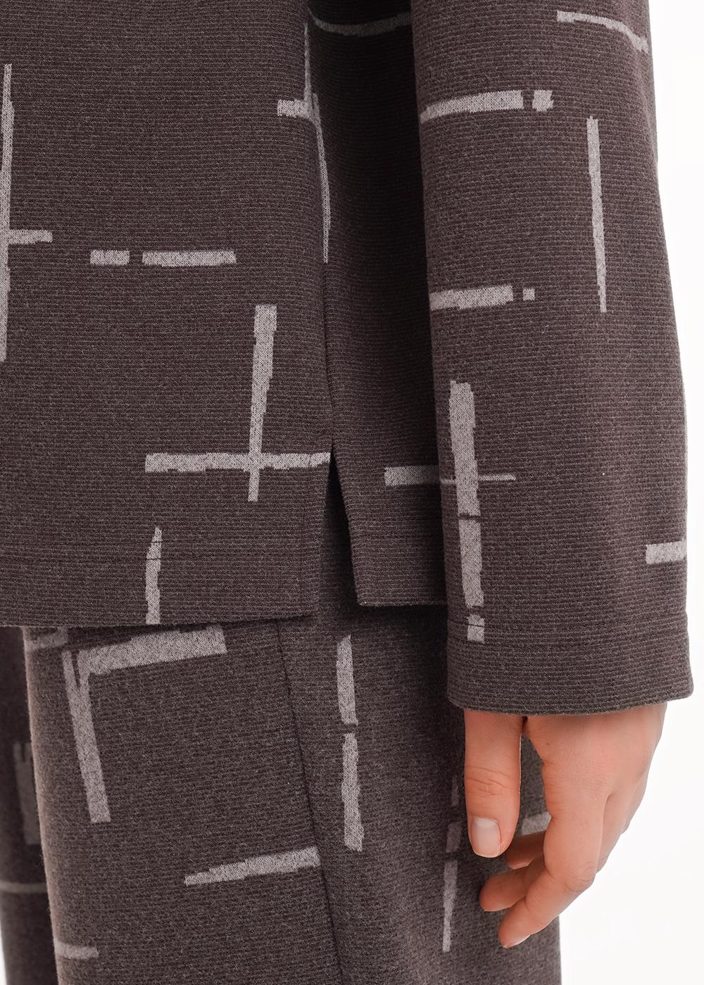 Джемпер прямого силуэта из поливискозного трикотажного полотна джерси. Спущенный длинный рукав. По горловине отложной вязаный воротник с планкой. Боковые разрезы.
