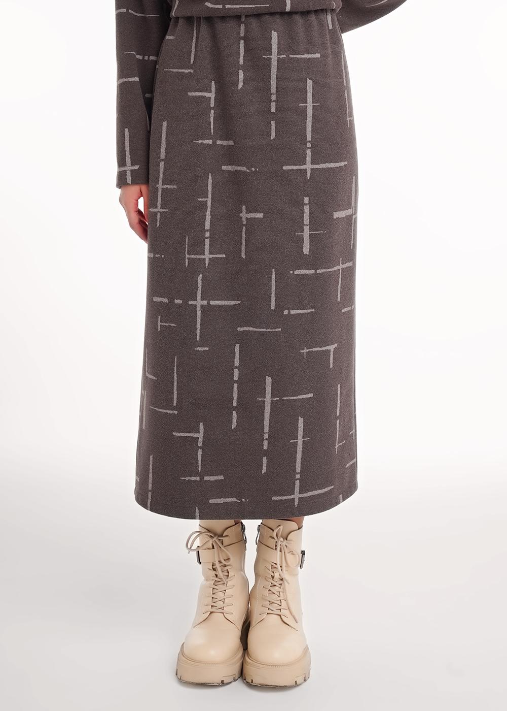 Юбка миди прямого силуэта из поливискозного трикотажного полотна джерси. По талии внутренняя резинка. На спинке средний шов с застежкой на молнию, внизу шлица.