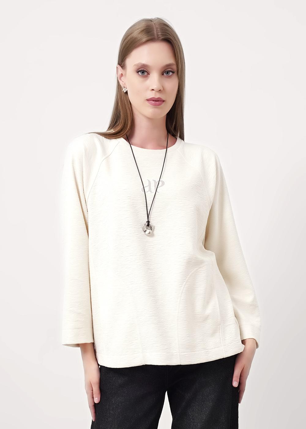 Джемпер прямого силуэта из трикотажного полотна джерси фактурное. Округлая горловина с обтачкой. Длинный рукав реглан,сверху по плечу вытачка. Спереди вертикальные резы с карманами в шве и закреплением мешковины. Боковые разрезы.Спереди вышивка.