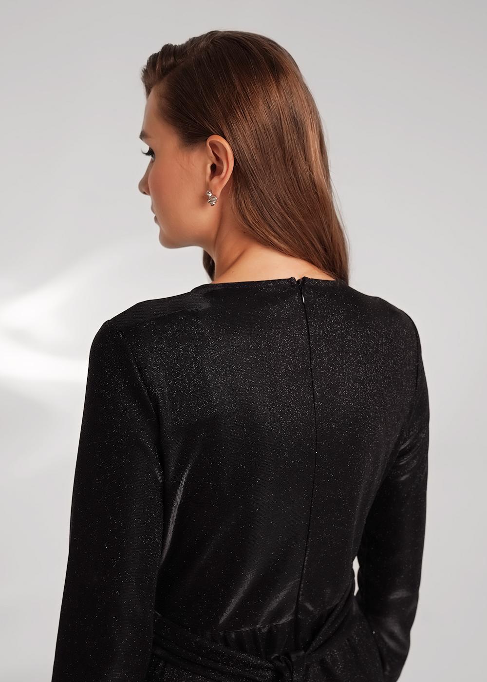 Платье из трикотажного полотна с блеском. Втачной рукав длиной 7/8. Округлая горловина. По переду средний шов до талии с имитацией запаха по груди, переходящая на спинку в завязки. По спинке рез по линии талии и средний шов с застежкой на молнию.