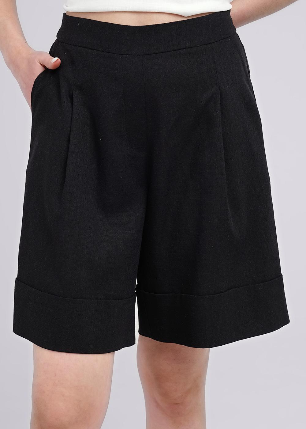 Шорты из тканого полотна лен с вискозой, длинные, свободные. Пояс по талии сзади на внутренней резинке. По переду имитация гульфика и вытачки, переходящия в складку. Боковые карманы с отрезным бочком. По низу изделия цельнокроеный манжет со складкой.