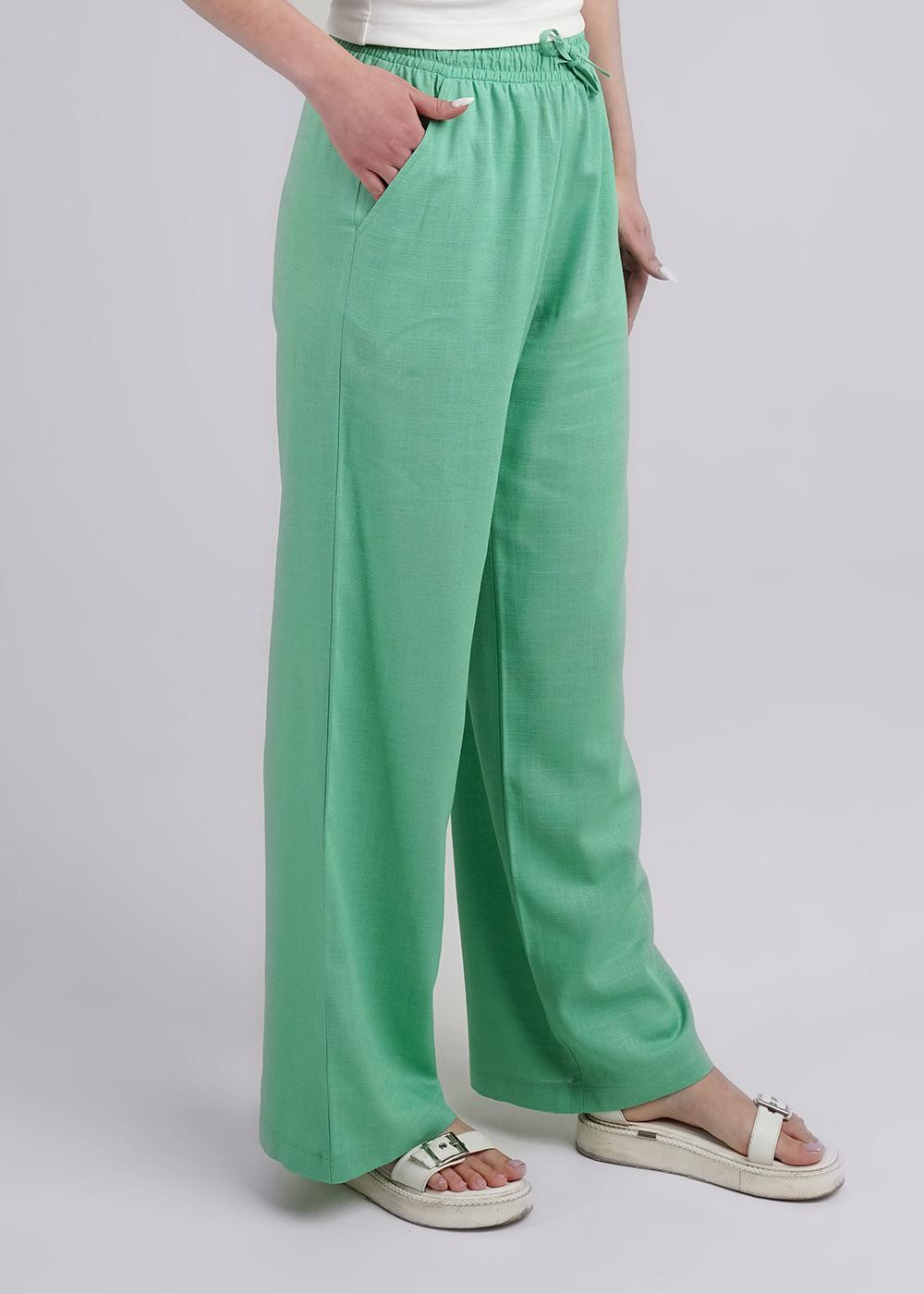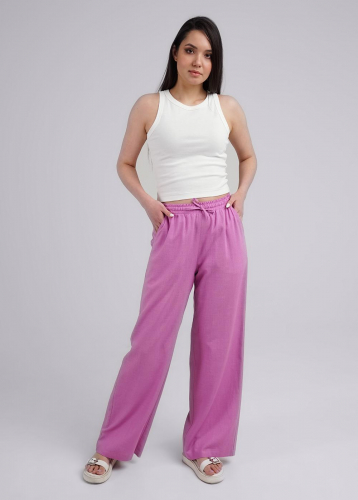 Брюки прямые,широкие из тканого полотна лен с вискозой. По талии притачной пояс на внутренней резинке, в поясе шнур из основной ткани. Боковые карманы в отрезном бочке.