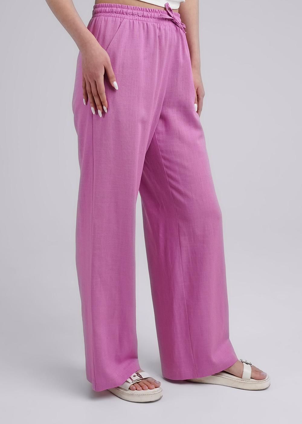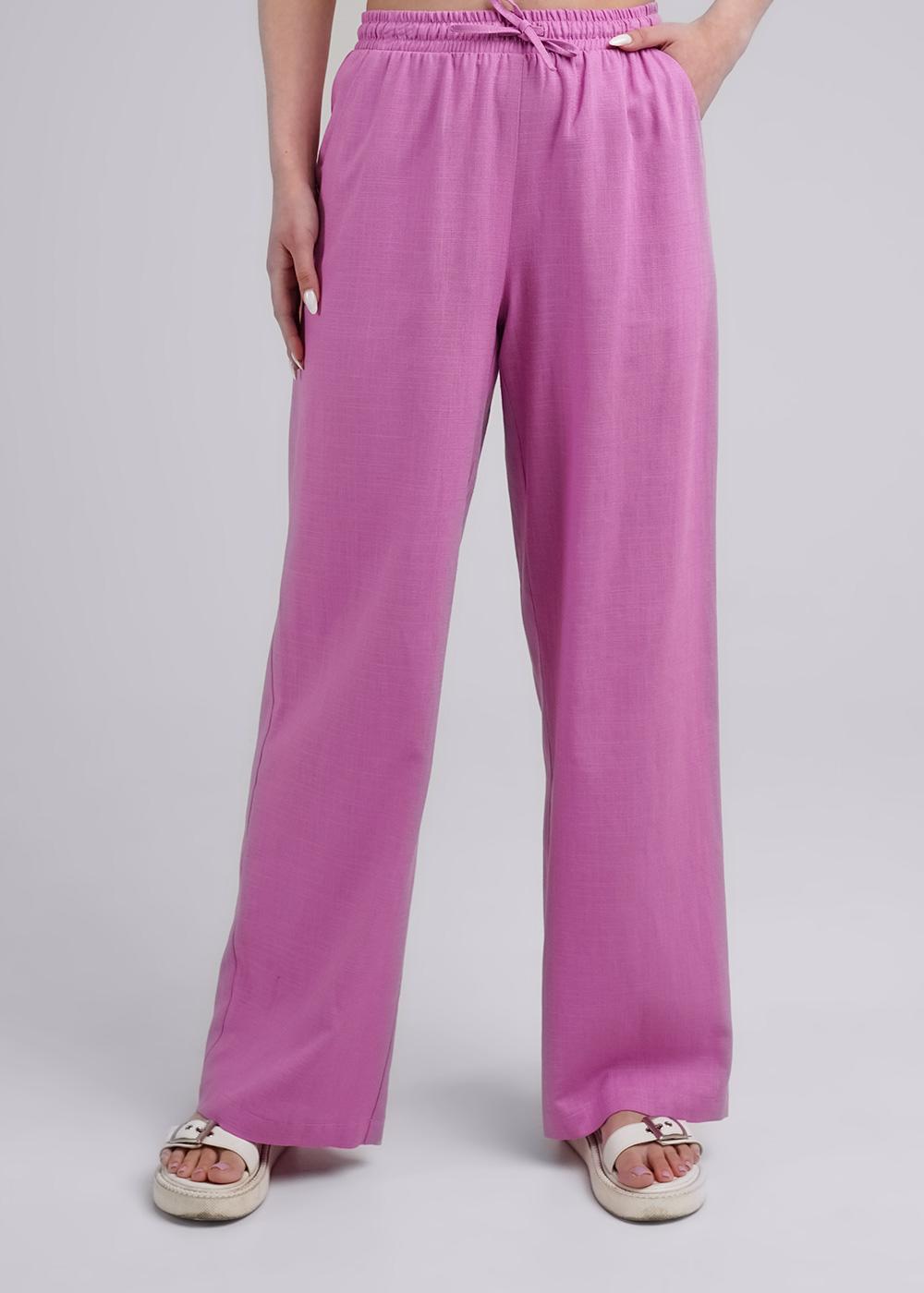 Брюки прямые,широкие из тканого полотна лен с вискозой. По талии притачной пояс на внутренней резинке, в поясе шнур из основной ткани. Боковые карманы в отрезном бочке.