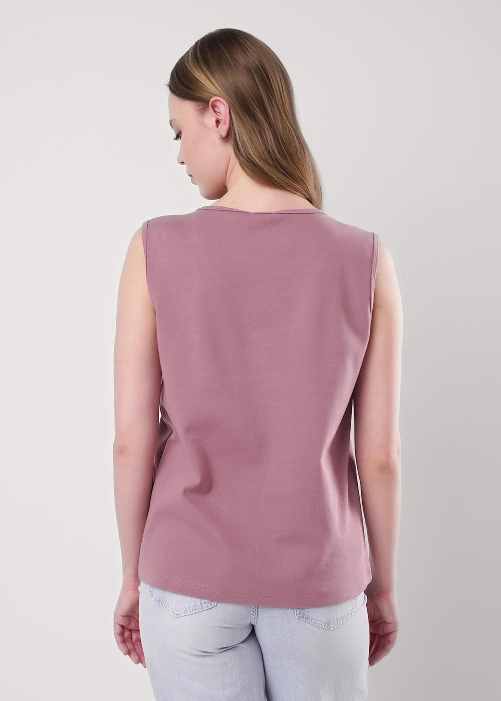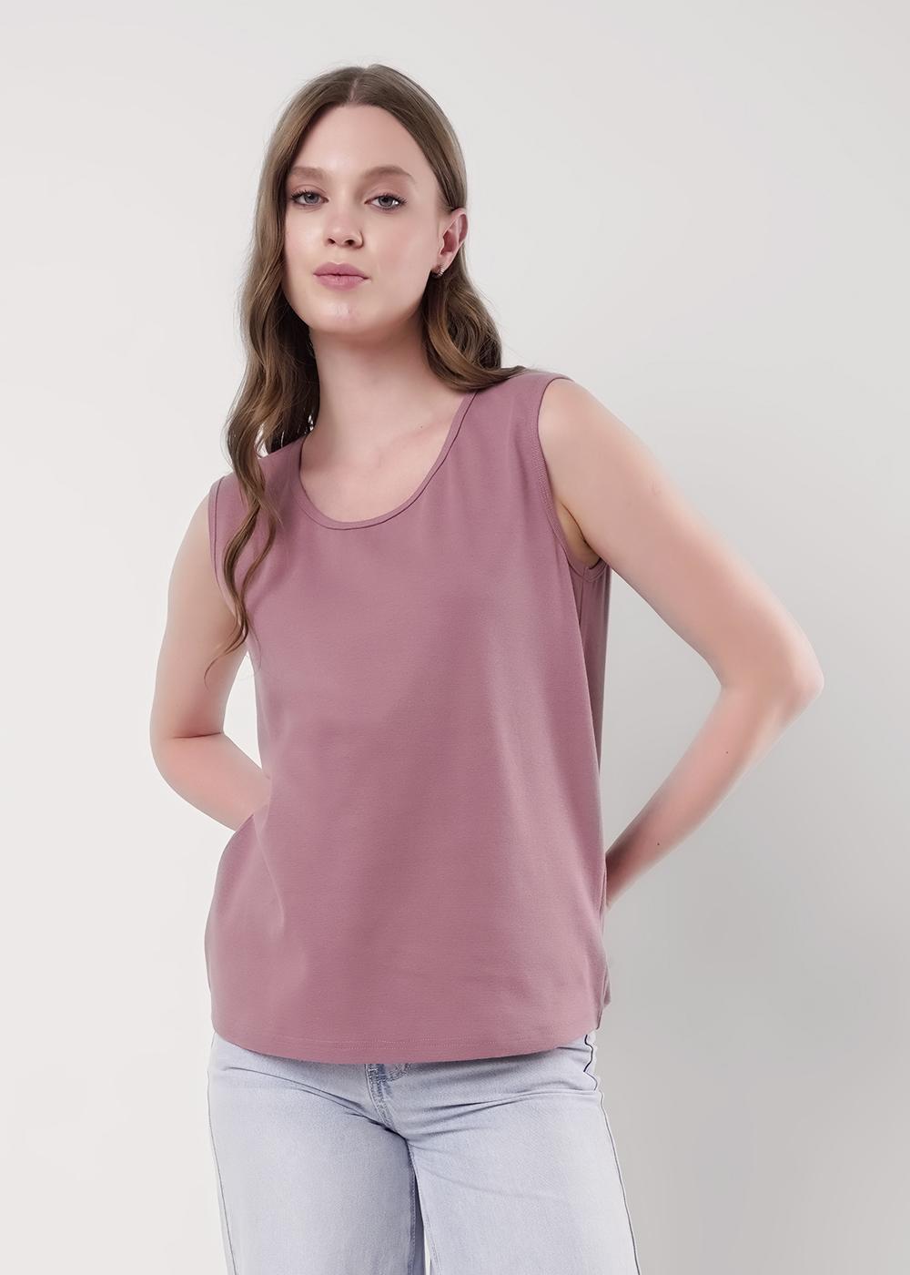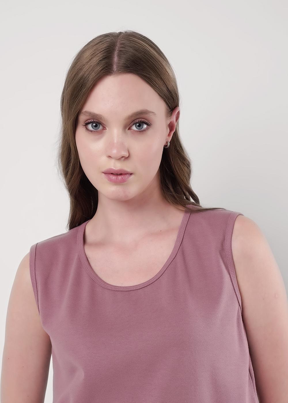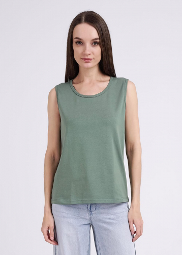 Майка из трикотажного полотна - рибана. Умеренный объем. Широкая бретель,округлая горловина. По пройме и горловине окантовка.