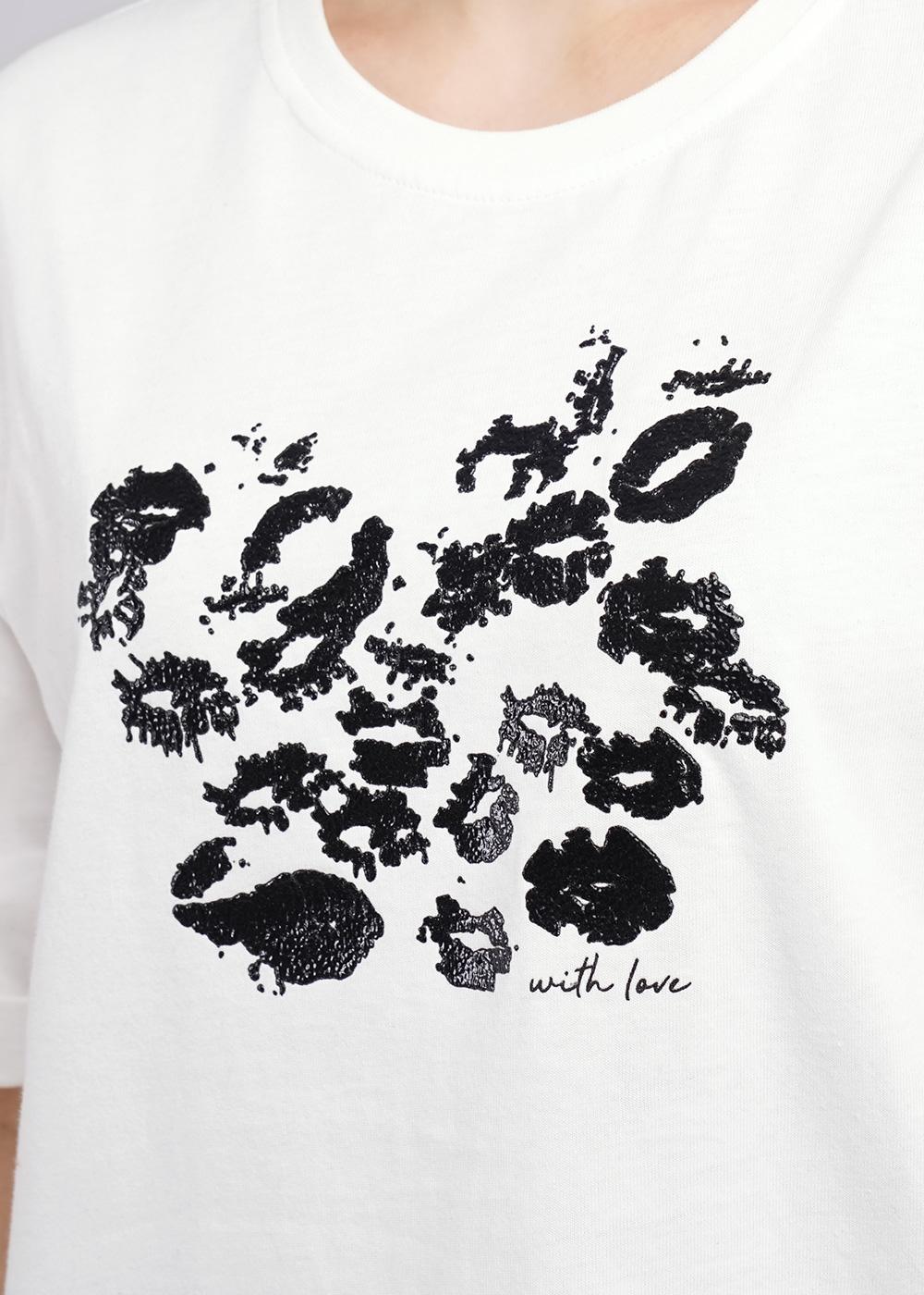 Джемпер из хлопкового трикотажного полотна. Короткий спущенный рукав с загибом. Круглый вырез горловины обработан рибаной. По переду принт.