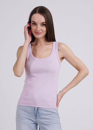 Майка из хлопкового трикотажного полотна рибана. Умеренный объем. Широкая бретель, округлая горловина. По горловине и пройме окантовка.