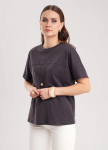 Вязаный джемпер умеренного объема из хлопковой пряжи с добавлением акрила. Короткий рукав со спущенной линией плеча. Длина рукава до локтя. Округлая горловина с бейкой. На детали переда термонаклейка.