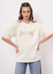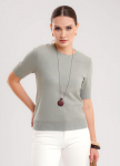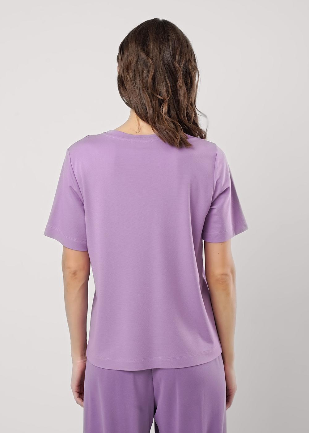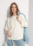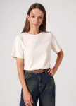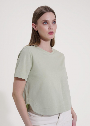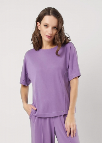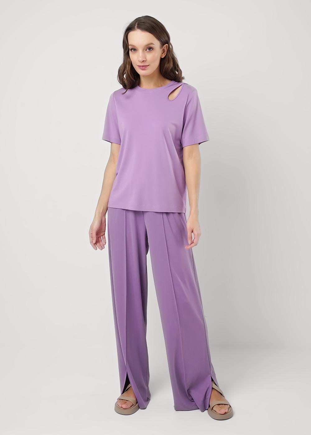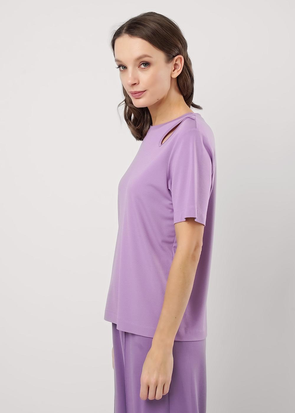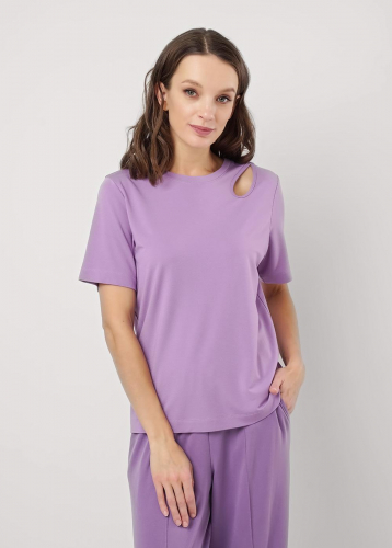 Футболка прямого силуэта из трикотажного полотна интерлок. Короткий втачной рукав. Округлая горловина с обтачкой. По левой линии плеча фигурный вырез с окантовкой.