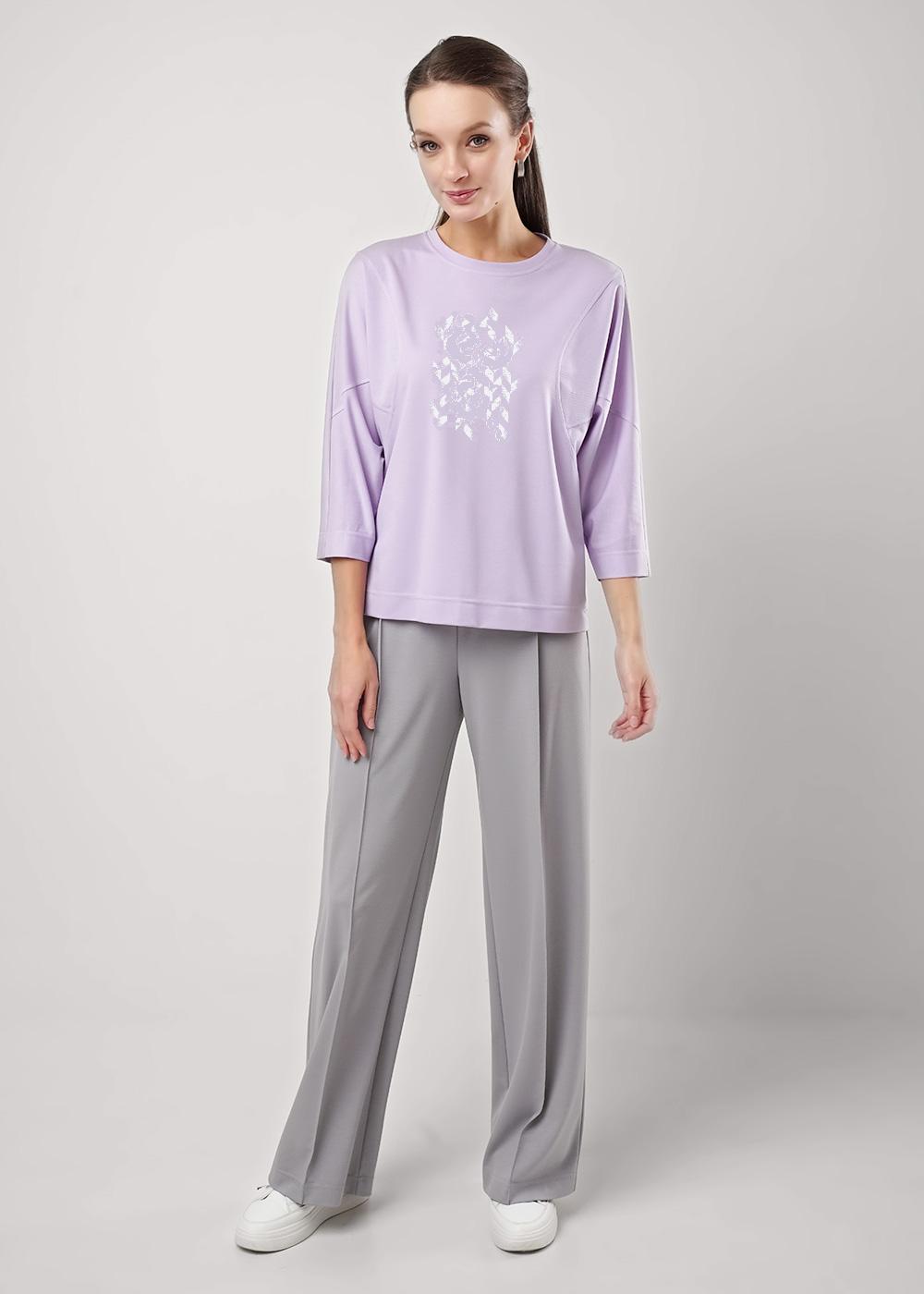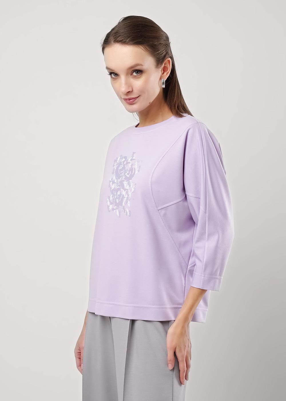 Джемпер свободного кроя из вискозного трикотажного полотна. Округлая горловина с обтачкой. Цельнокроеный рукав длиной 3/4. По переду и спинке отстроченные резы. По спинке средний шов. По бокам небольшие разрезы. Спереди принт фольга.
