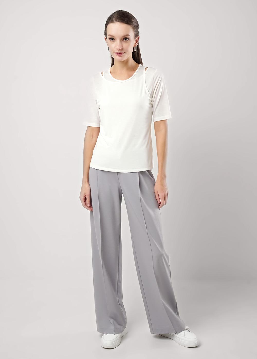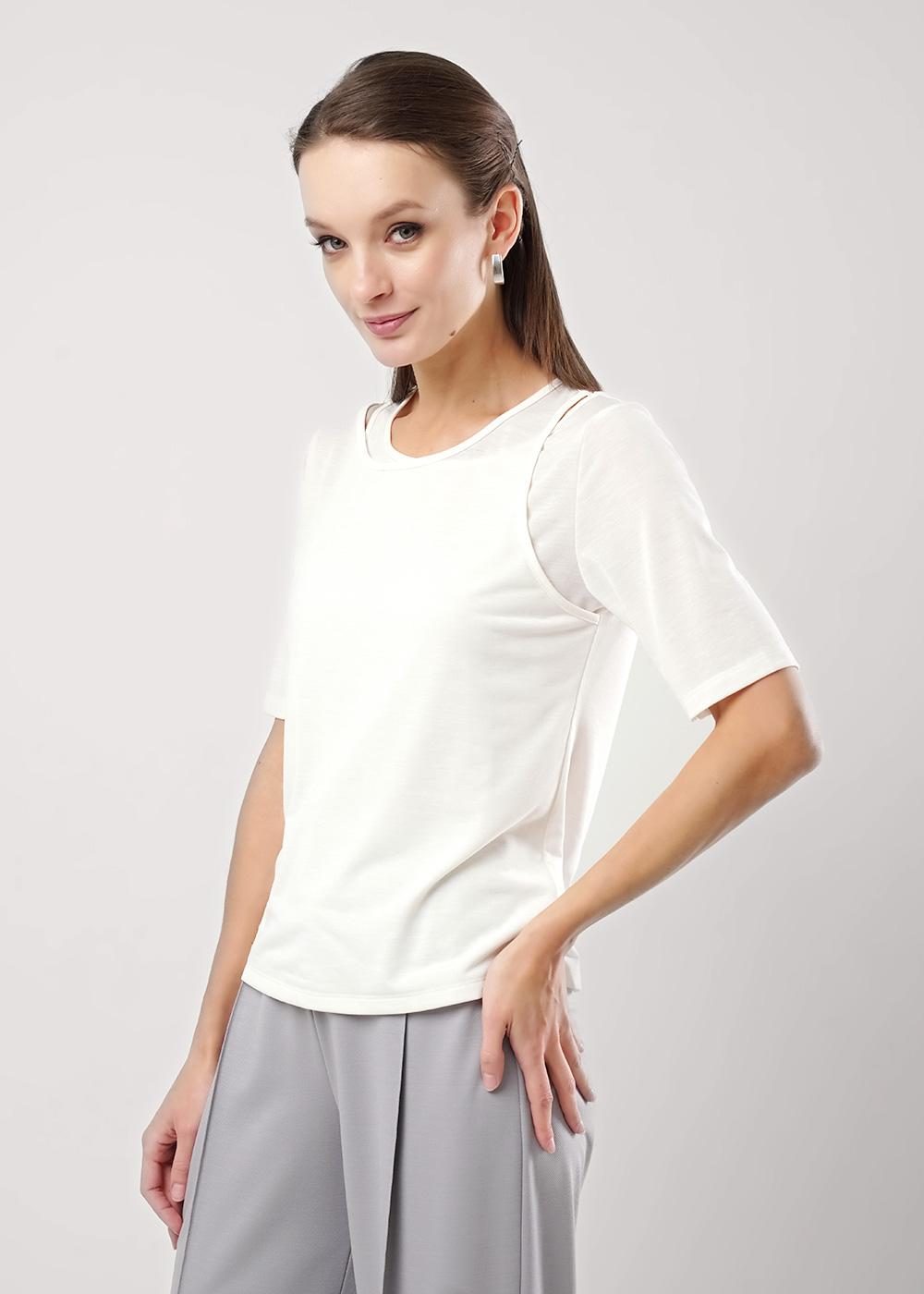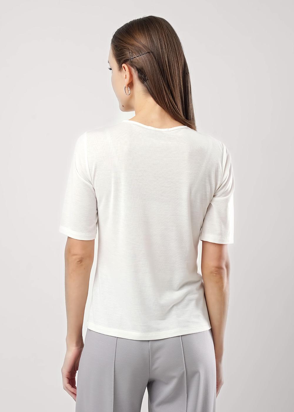 Джемпер из вискозного трикотажного полотна , прямого силуэта. Короткий втачной рукав. Округлая горловина с окантовкой. Спереди фигурный вырез с окантовкой.