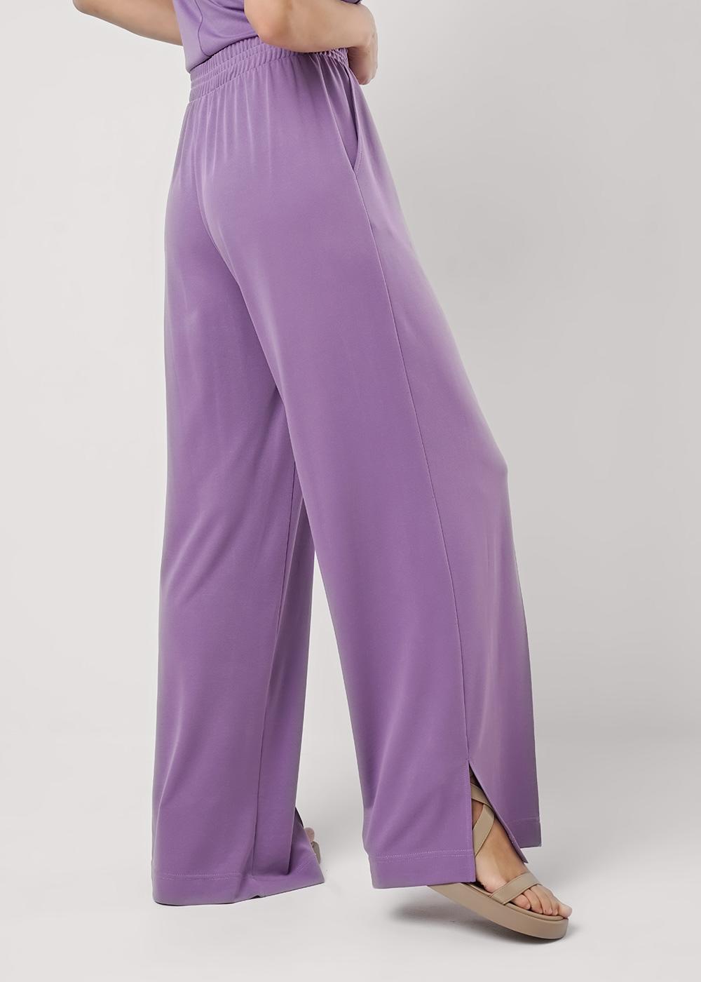 Брюки широкие из вискозного трикотажного полотна пике. По талии притачной пояс с внутренней резинкой. Боковые карманы с отрезным бочком. По переду и спинке защипы, внизу боковые разрезы.