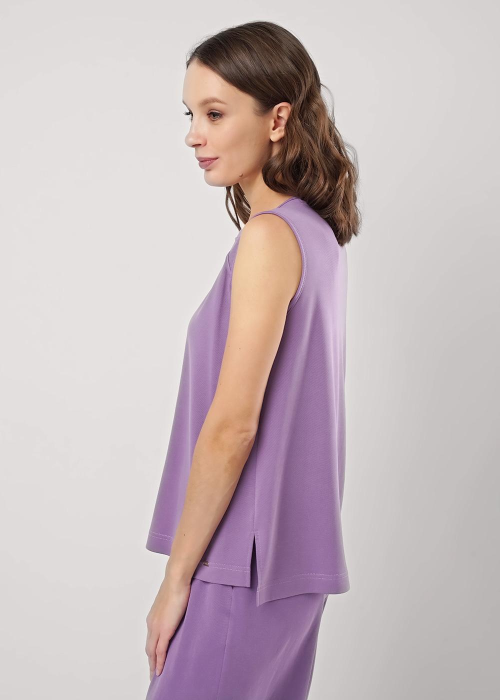 Джемпер без рукавов широкое плечо, из вискозного трикотажного полотна пике прямого силуэта. По горловине спинки и пройме окантовка. Боковые разрезы, внизу нашивка металл.
