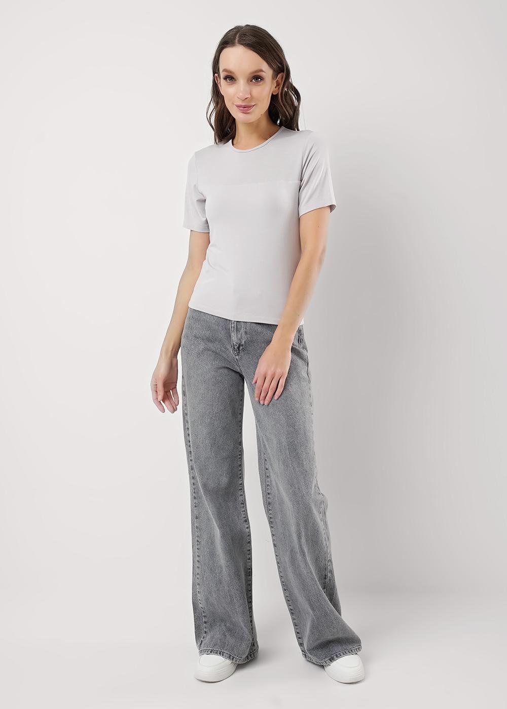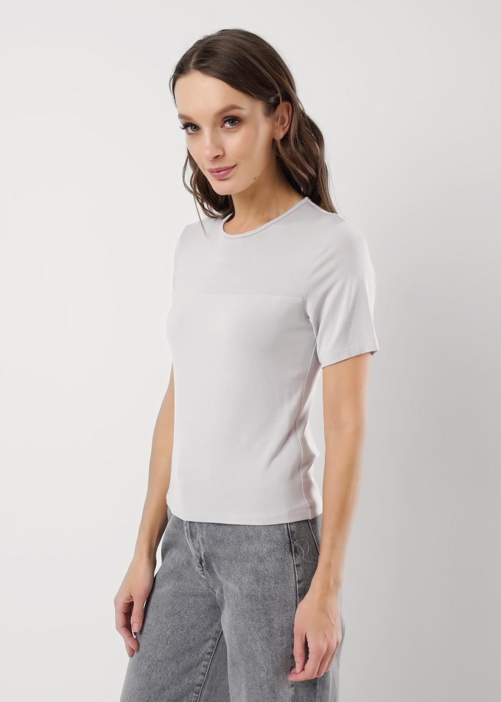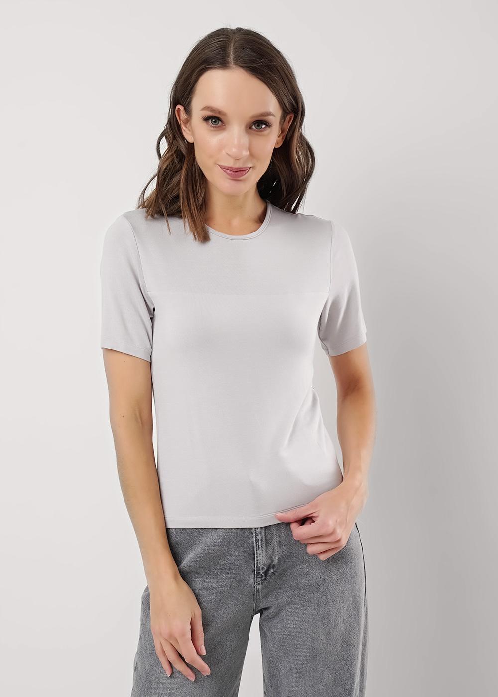 Футболка из трикотажного полотна с добавлением модала. Округлая горловина с окантовкой. Короткий втачной рукав. Спереди кокетка, нижняя часть переда двойная.