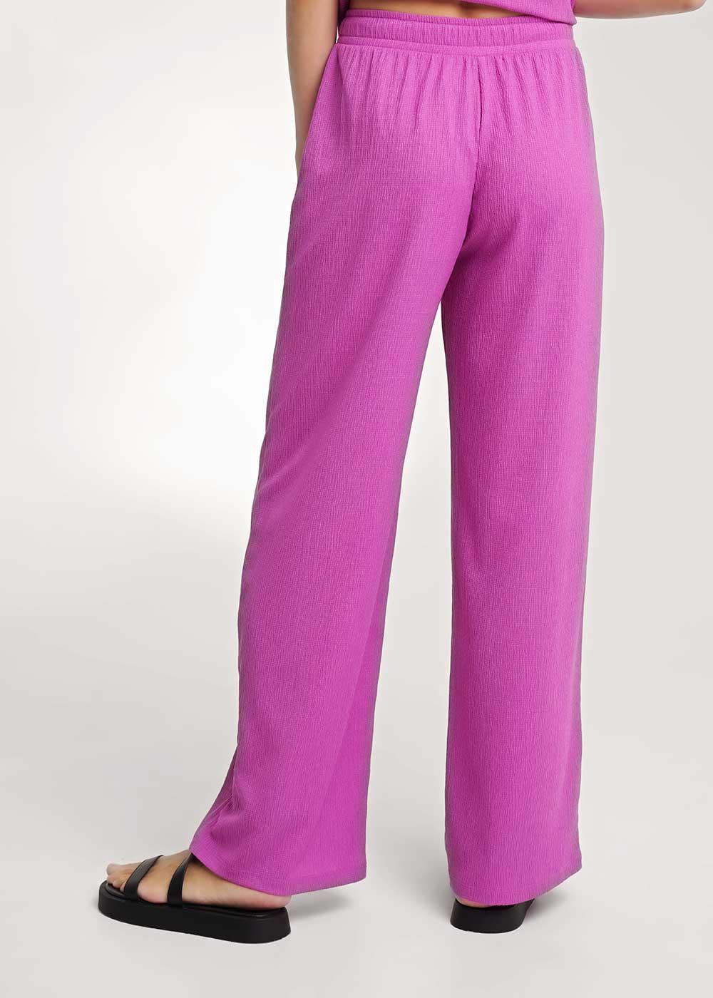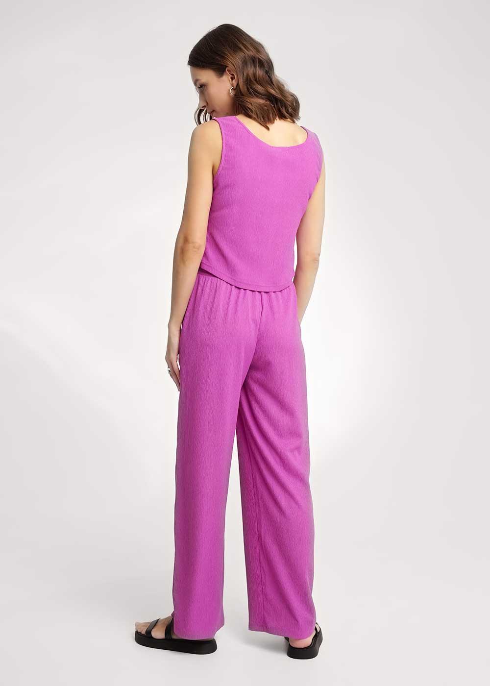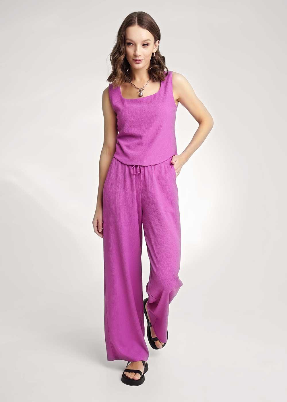 Брюки широкие из трикотажного полотна джерси. По талии притачной пояс на внутренней резинке со шнуром из основного полотна. Боковые карманы с отрезным бочком.