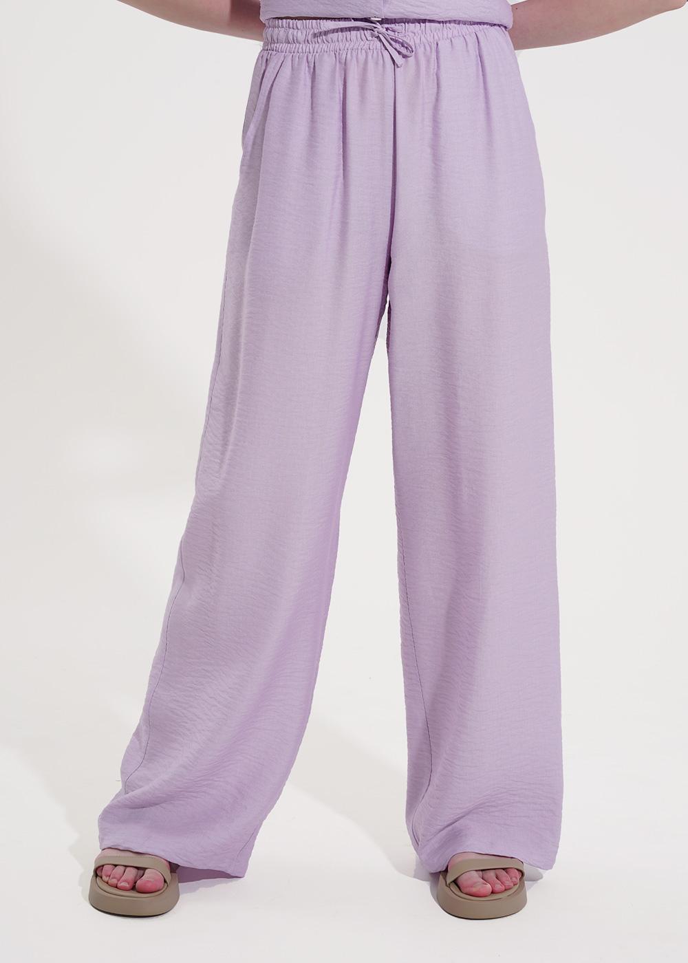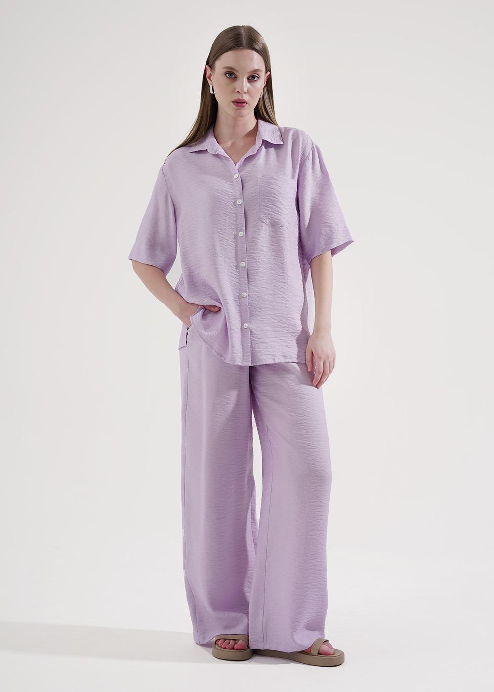 Комплект из текстильного полотна штапель-креп. Блузка свободного кроя. Втачной рукав. Отложной воротник спереди планка на пуговицах,накладной карман.Боковые разрезы.Брюки широкие. По талии пояс на резинке,с завязками. Боковые карманы в отрезном бочке.
