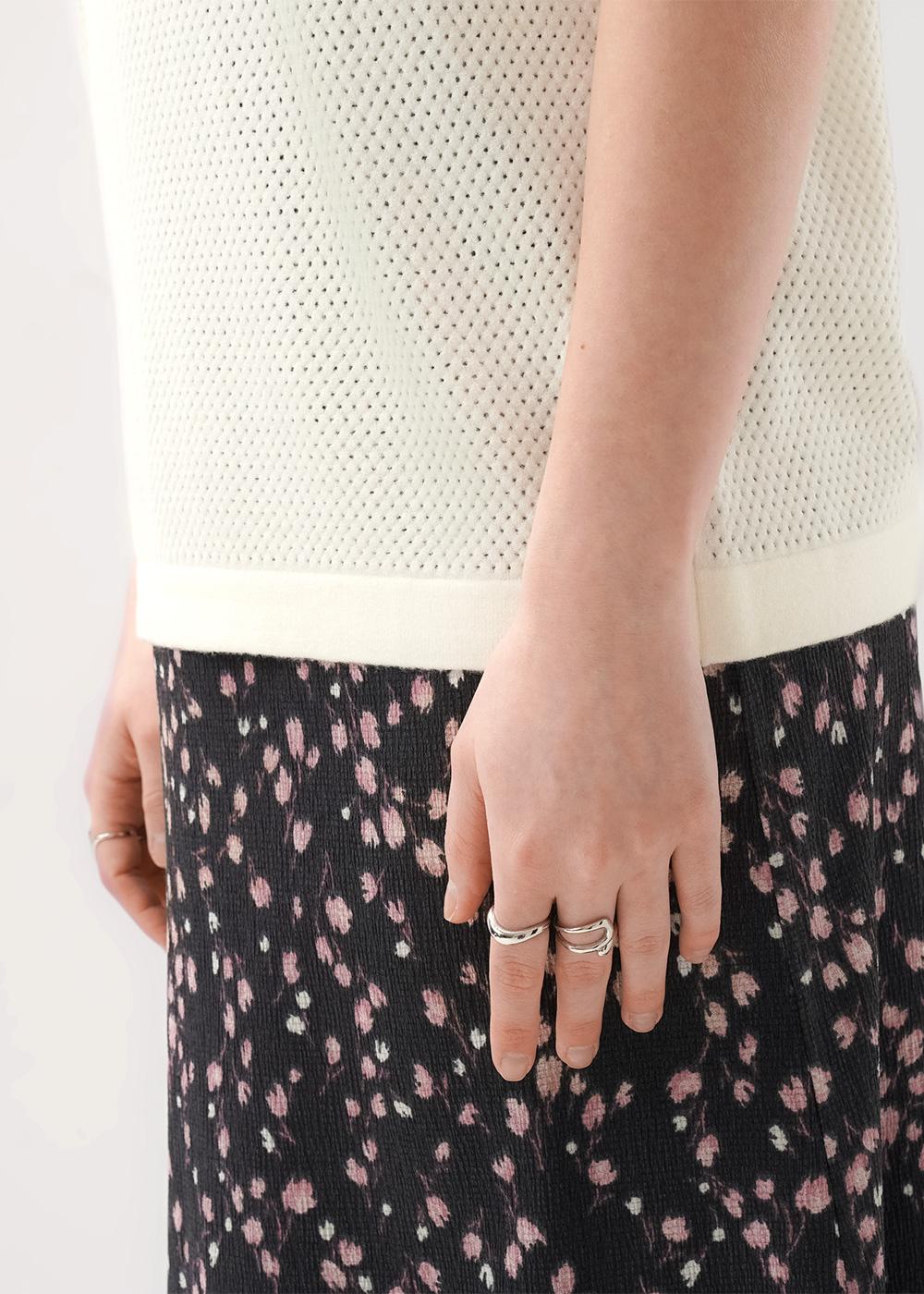 Вязаный джемпер прямого силуэта из вискозной пряжи с добавлением нейлона, ажурного переплетения. Короткий втачной рукав. Округлая горловина с бейкой. По низу изделия и рукава сдвоенная гладь.
