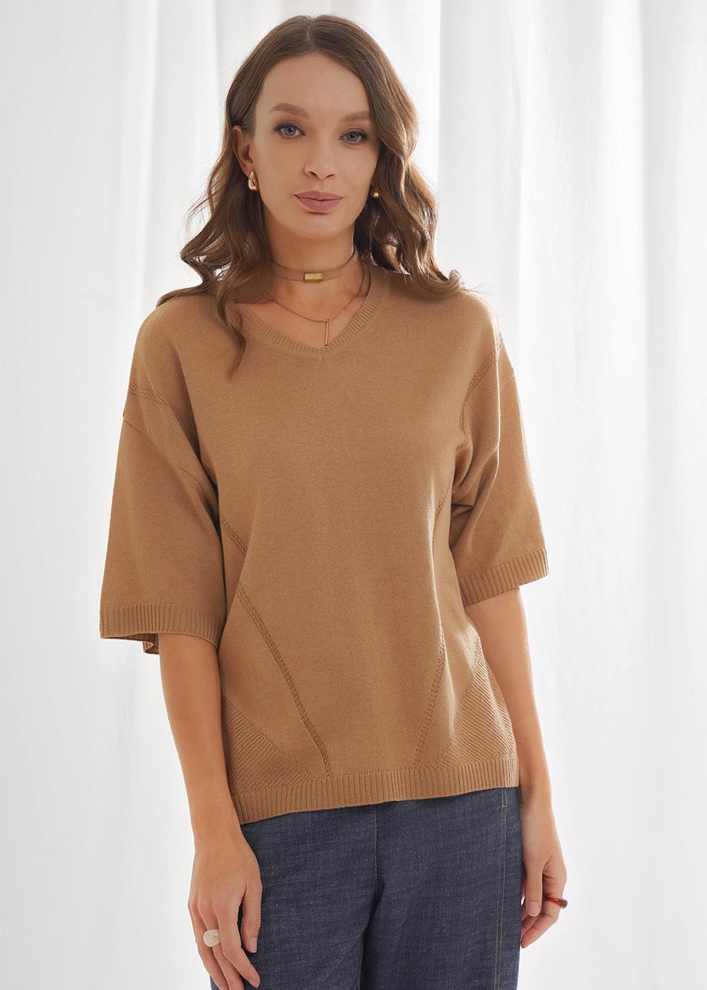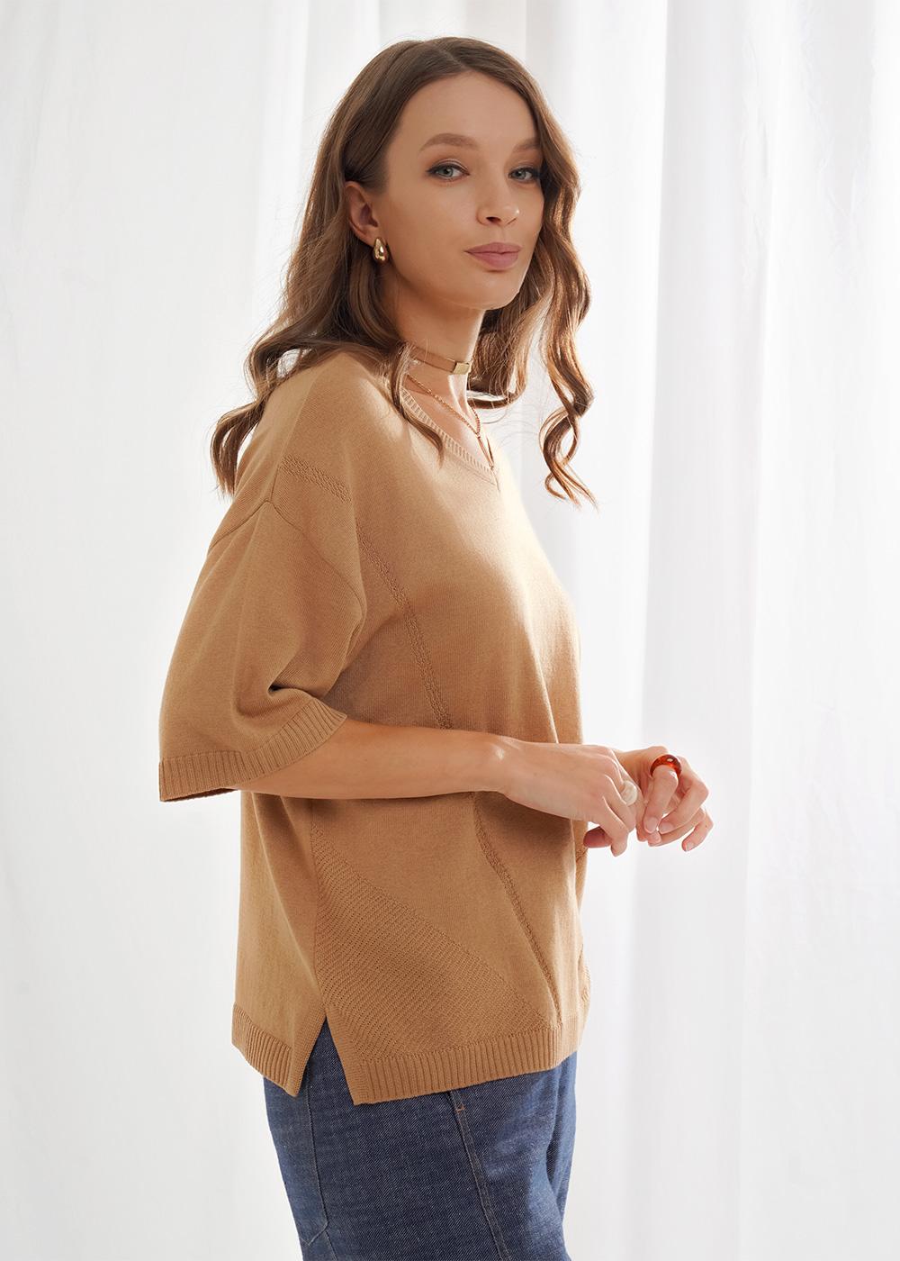 Вязаный джемпер свободного кроя из хлопковой пряжи с добавлением акрила, переплетение гладь. V-образный вырез горловины с бейкой. Короткий рукав со спущенной линией плеча. Боковые разрезы. По низу изделия и рукавов узкие манжеты.