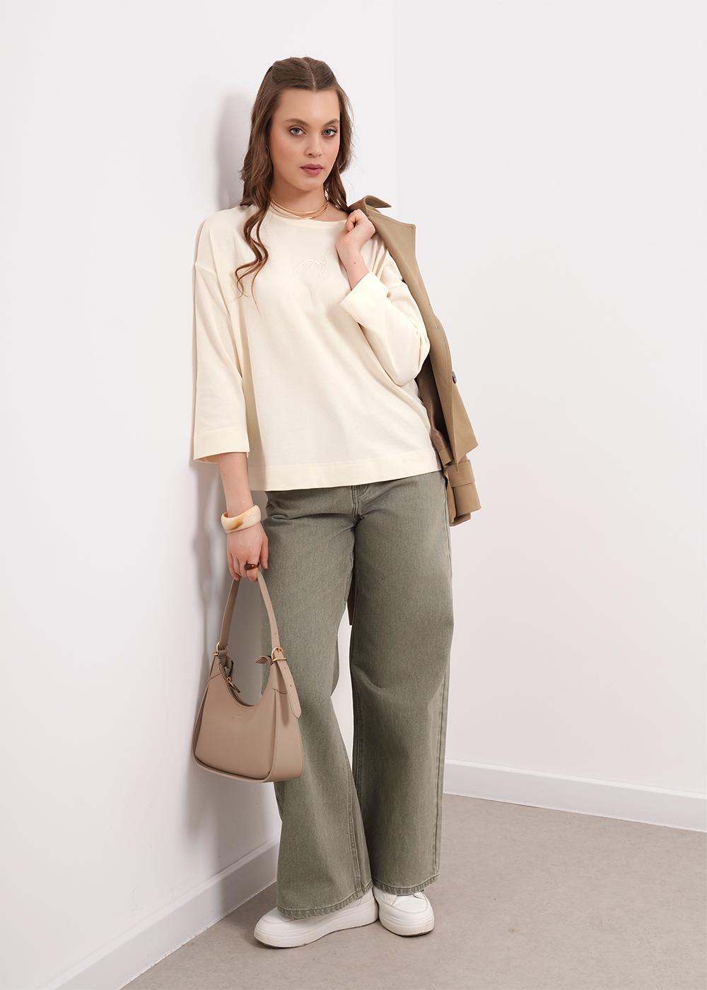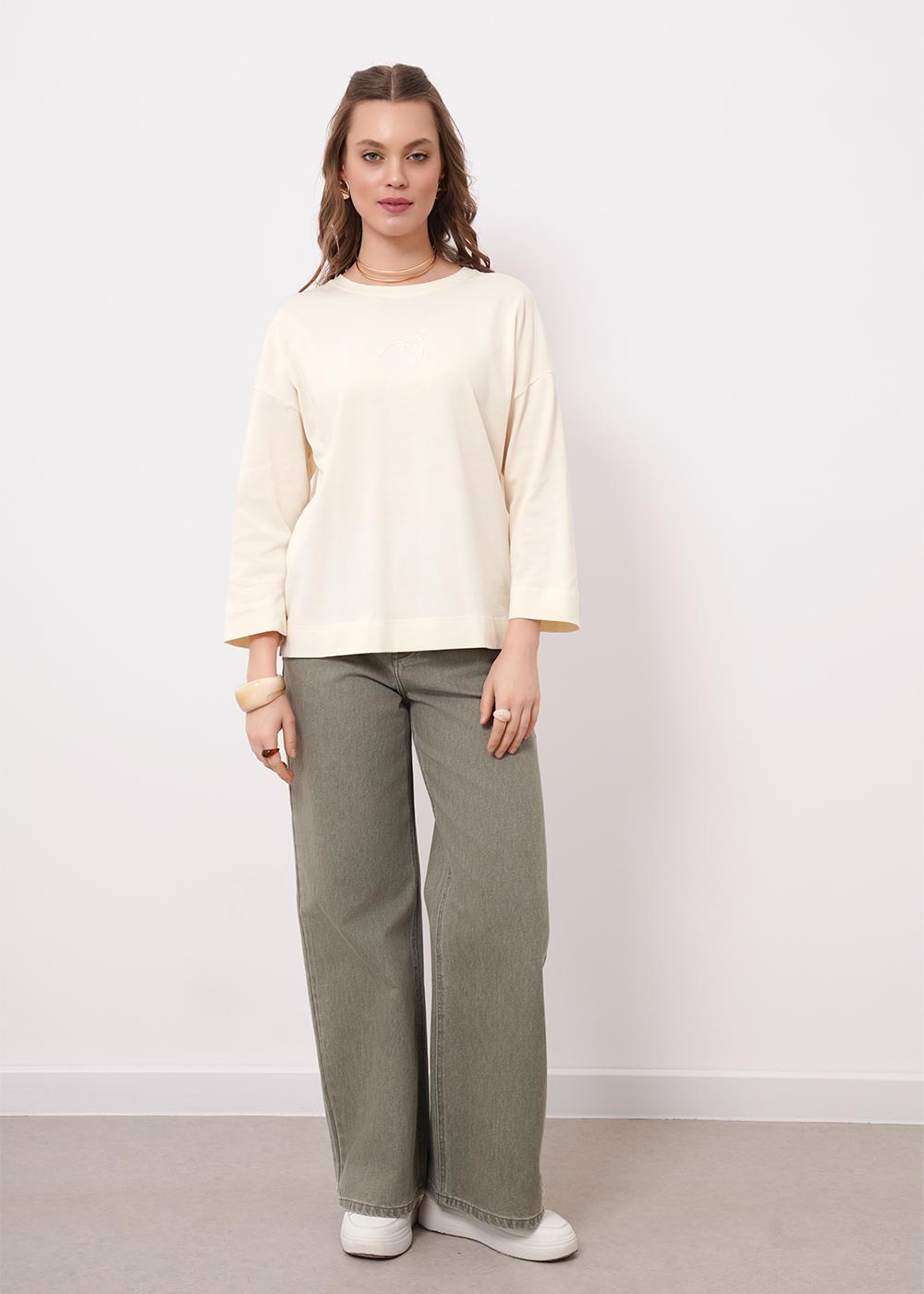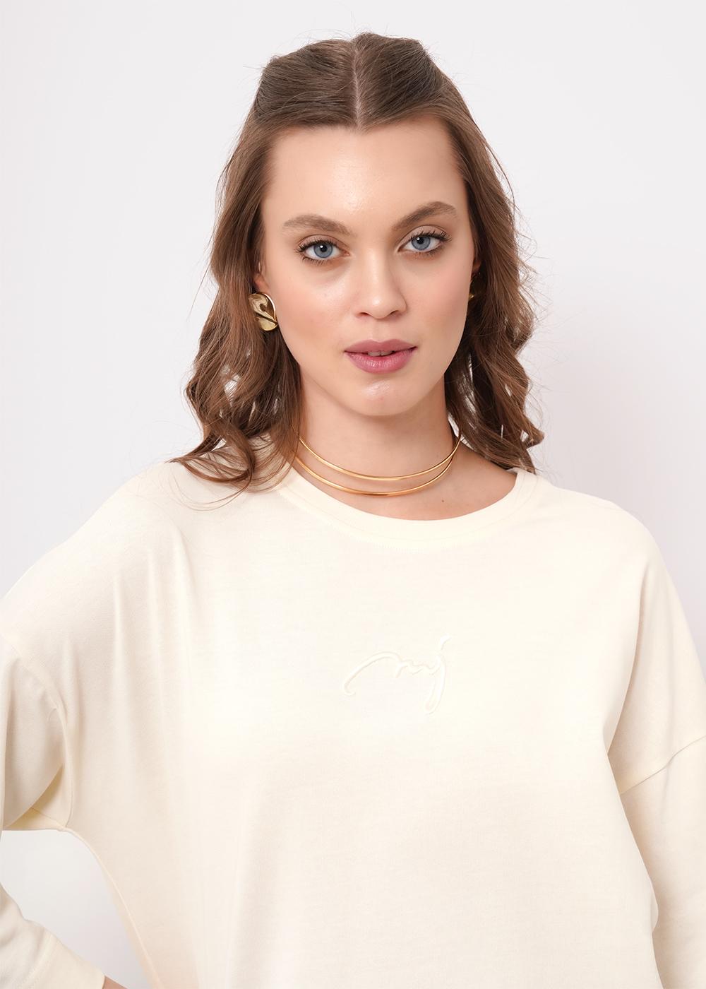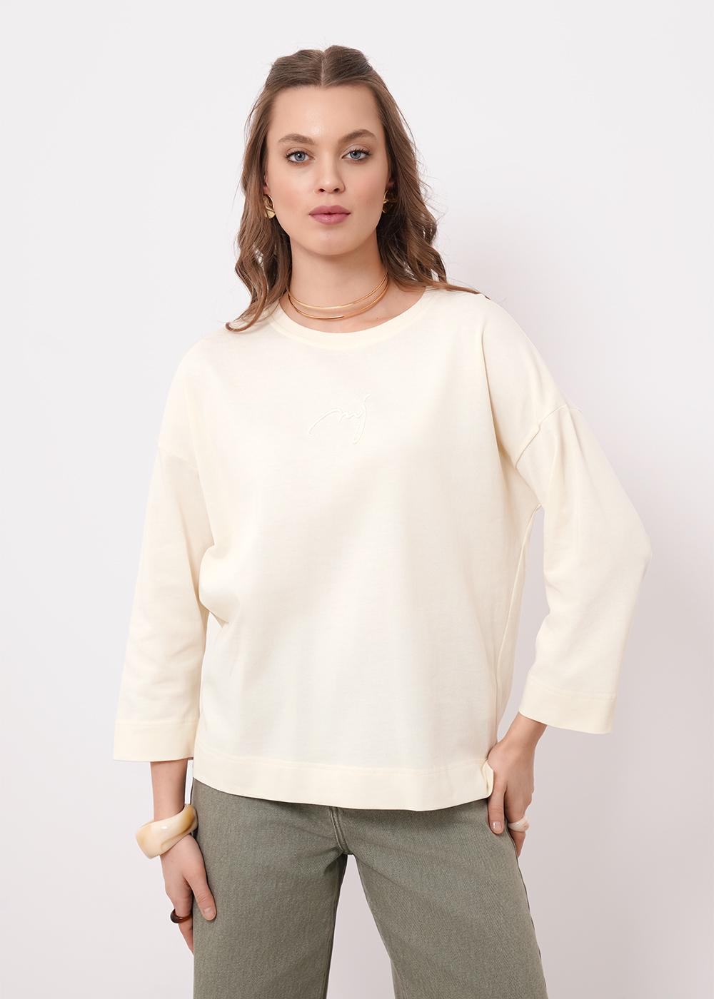 Фуфайка из хлопкового трикотажного полотна умеренного объема. Длинный рукав со спущенной линией плеча. Округлая горловина с обтачкой. Сзади средний шов. По низу рукава и изделия широкая подгибка с разрезами. Спереди вышивка с пеной.