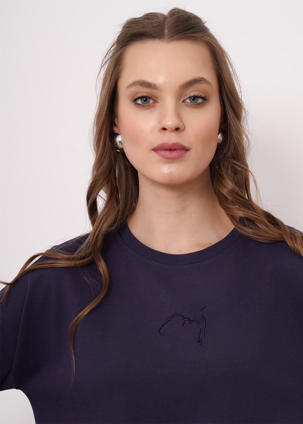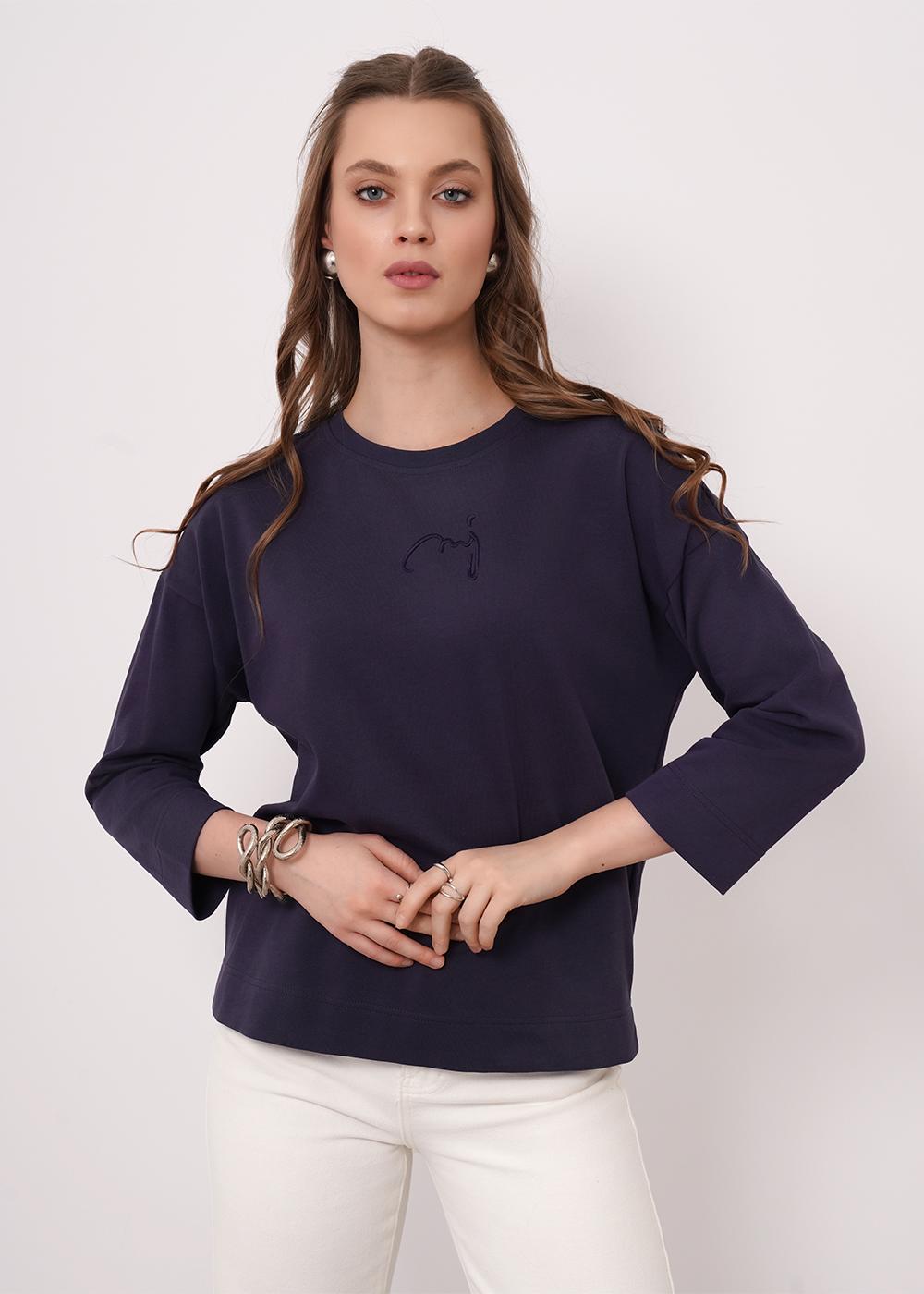 Фуфайка из хлопкового трикотажного полотна умеренного объема. Длинный рукав со спущенной линией плеча. Округлая горловина с обтачкой. Сзади средний шов. По низу рукава и изделия широкая подгибка с разрезами. Спереди вышивка с пеной.