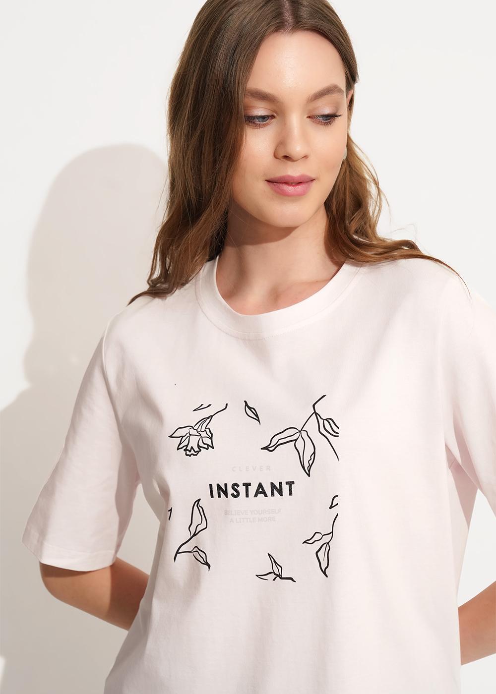 Футболка из хлопкового трикотажного полотна, прямого силуэта. Короткий втачной рукав. Округлая горловина с обтачкой. По переду принт.