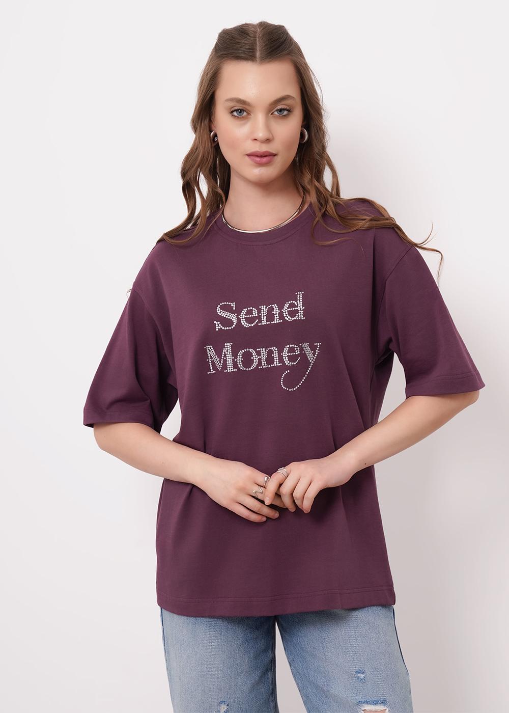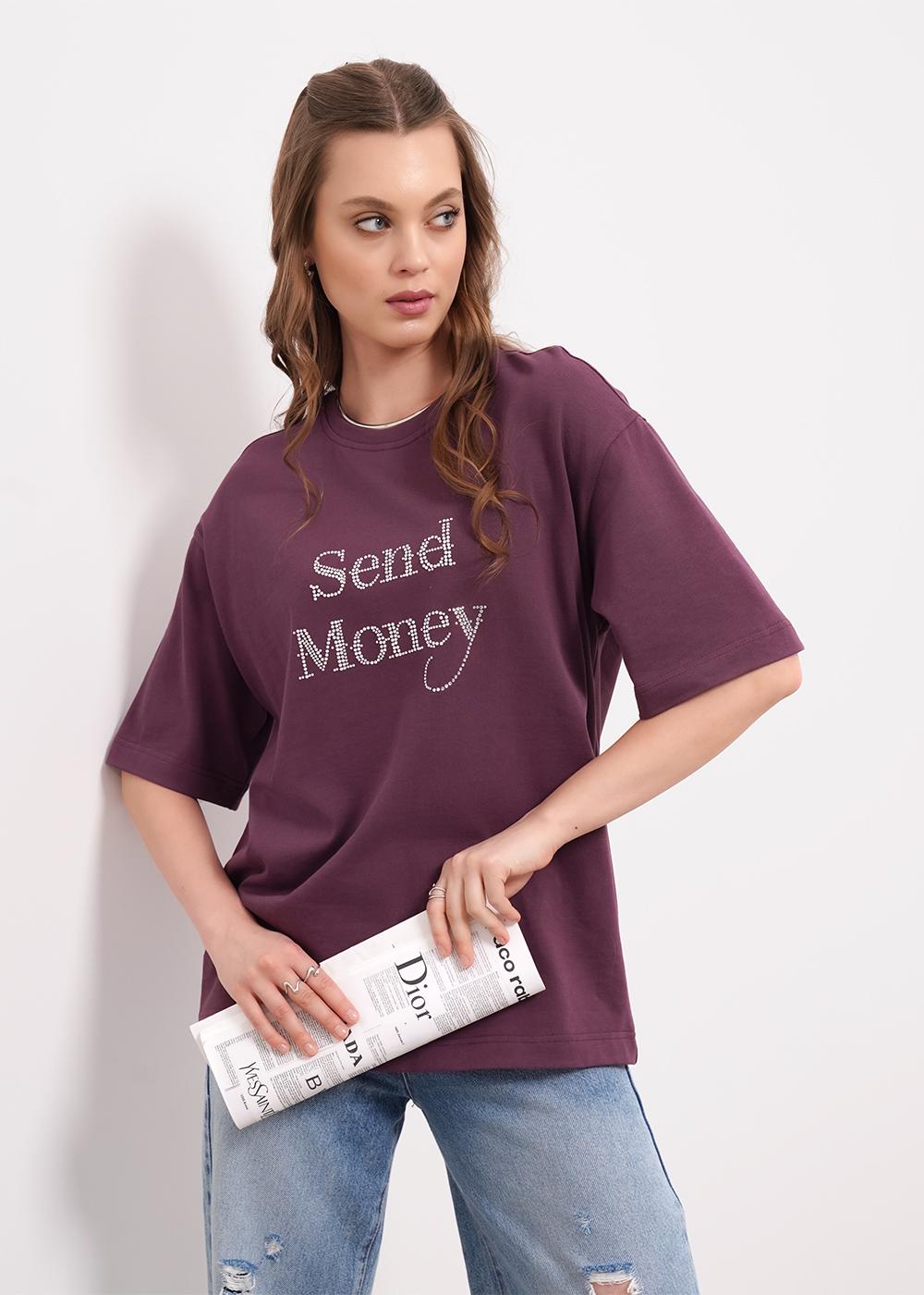 Футболка оверсайз из хлопкового трикотажного полотна. Короткий спущенный рукав. Округлая горловина с обтачкой из рибаны. По спинке средний шов. По переду термостразы.