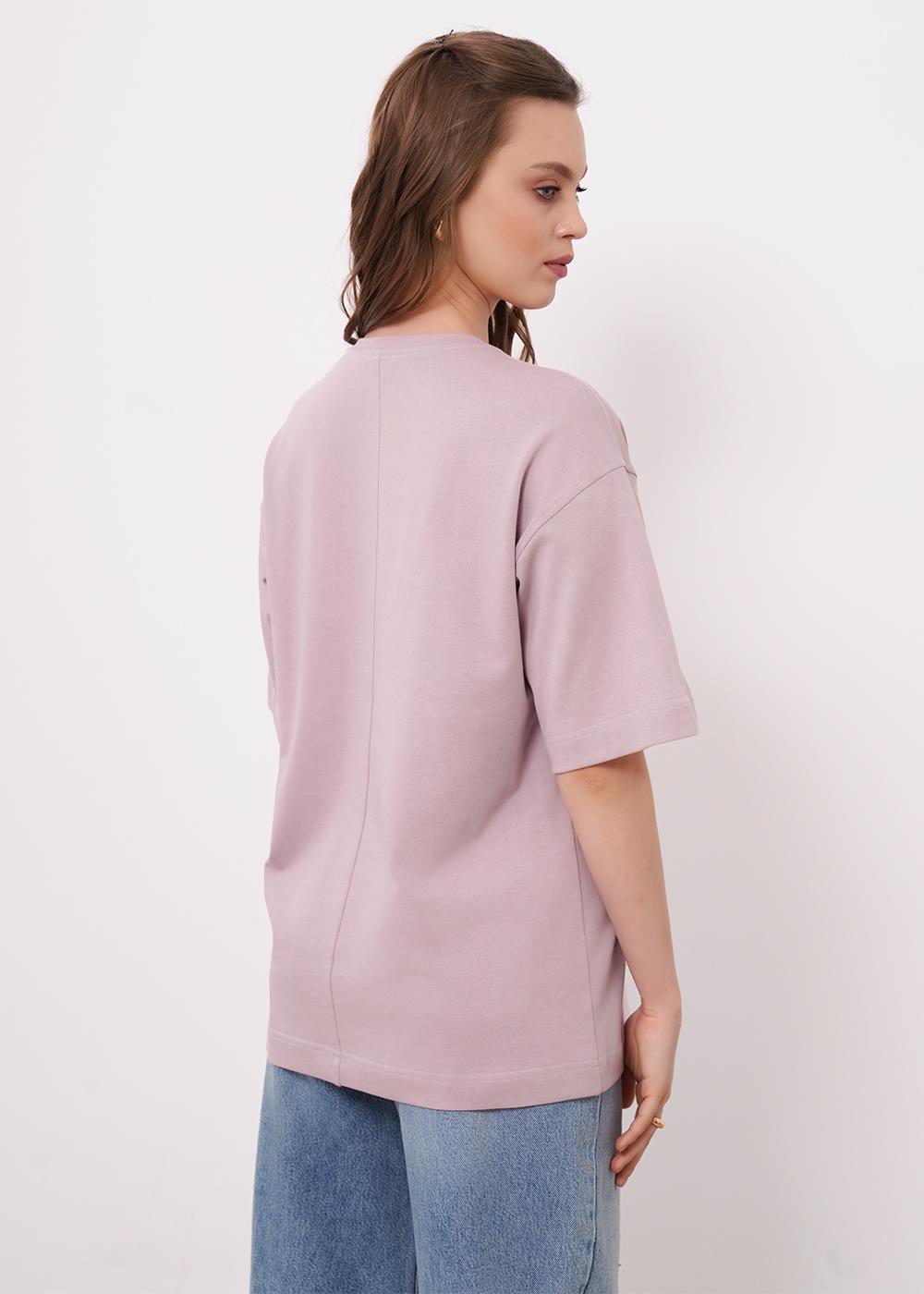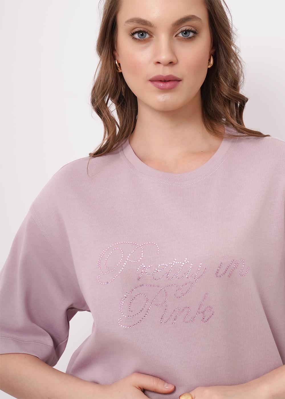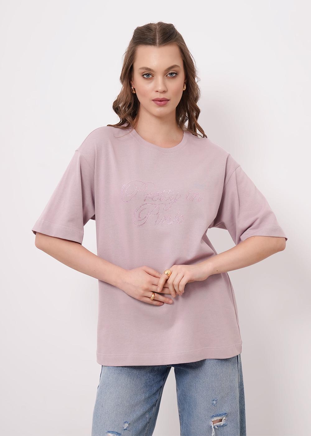 Футболка оверсайз из хлопкового трикотажного полотна. Короткий спущенный рукав. Округлая горловина с обтачкой из рибаны. По спинке средний шов. По переду термостразы.