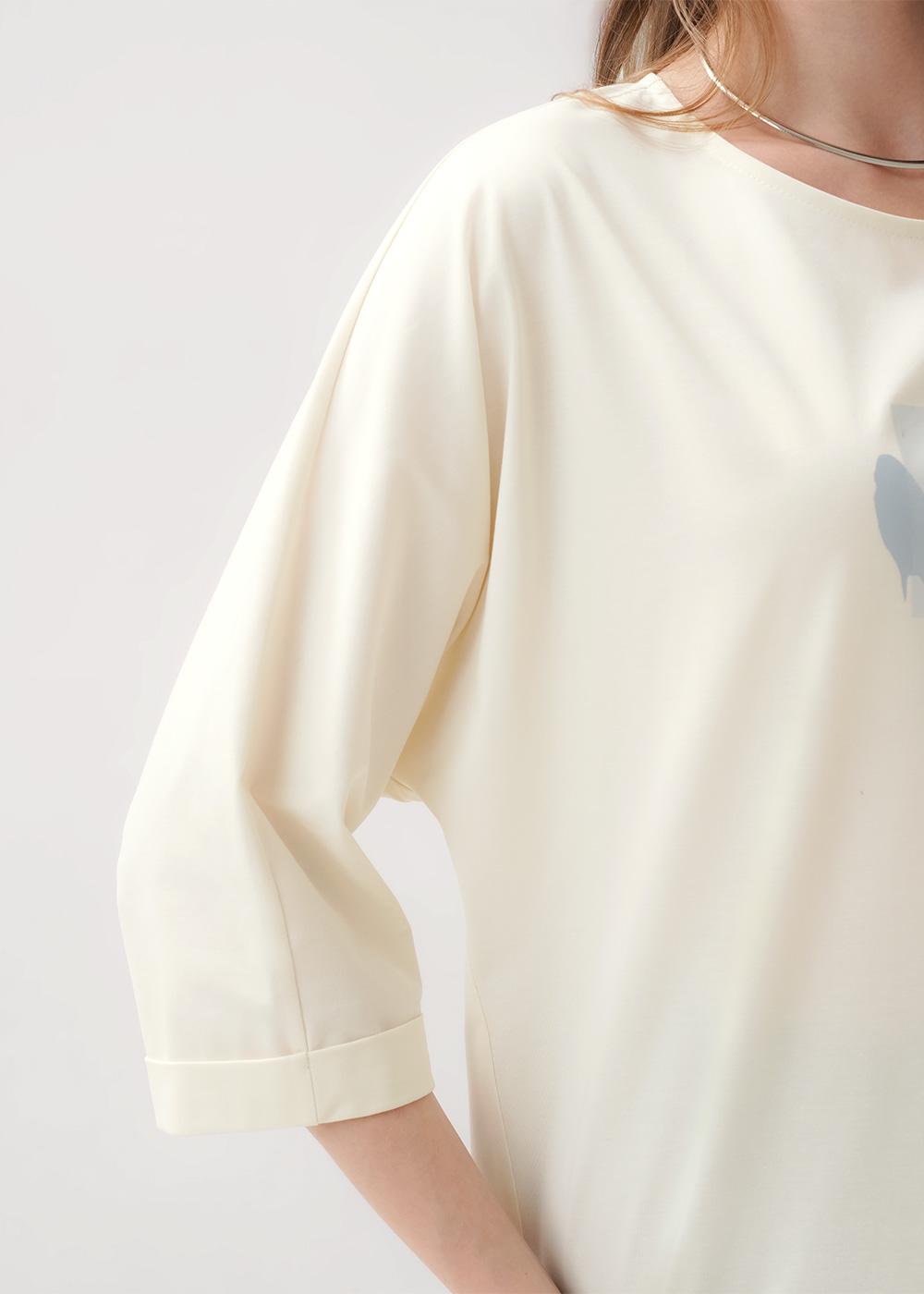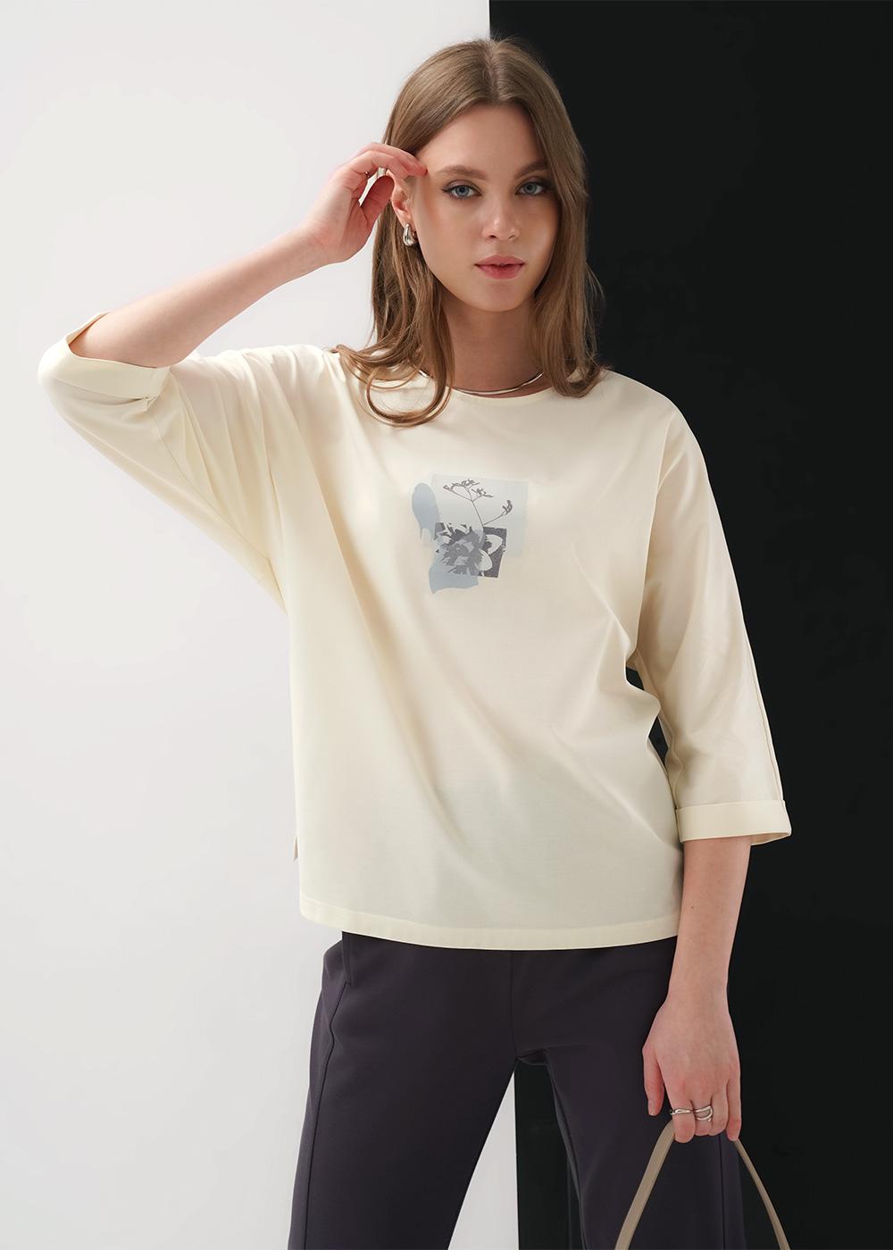 Джемпер из трикотажного полотна умеренного объема. Длинный цельнокроеный рукав по переду, по спинке рукав реглан. По низу рукава отвороты. Округлая горловина с внутренней обтачкой. По спинке средний шов. По низу изделия боковые разрезы. Спереди принт.