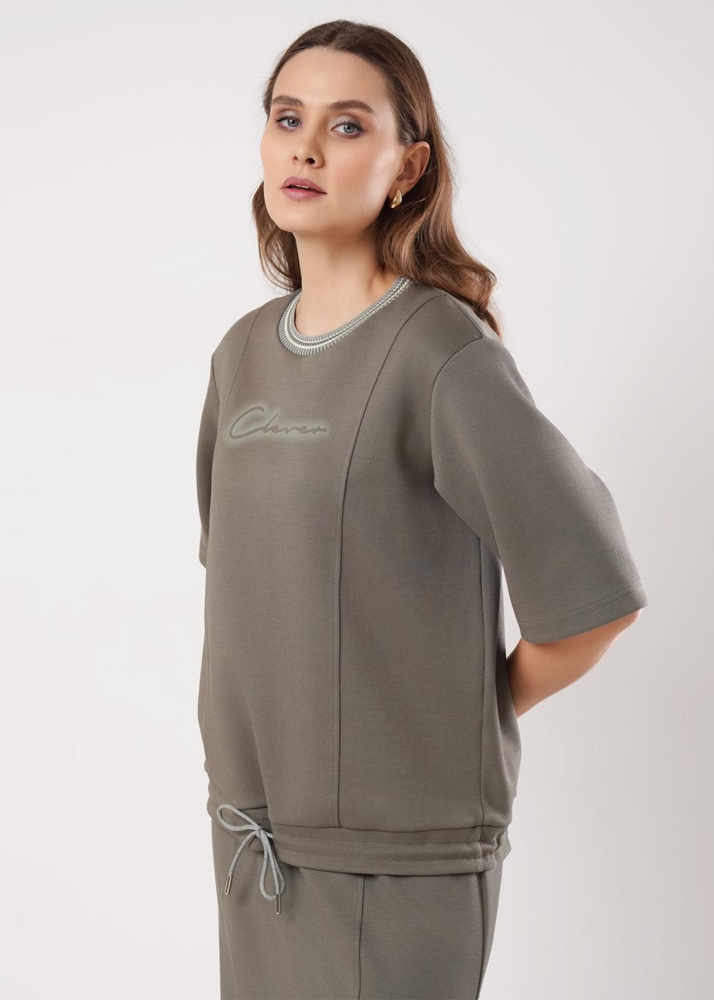 Джемпер свободного кроя из трикотажного полотна плотное пике. Короткий рукав со спущенной линией плеча. По переду рельефы. Округлая горловина с вязаной обтачкой. По низу изделия притачной манжет с кулисой и вязаным шнуром. Спереди принт с вышивкой.