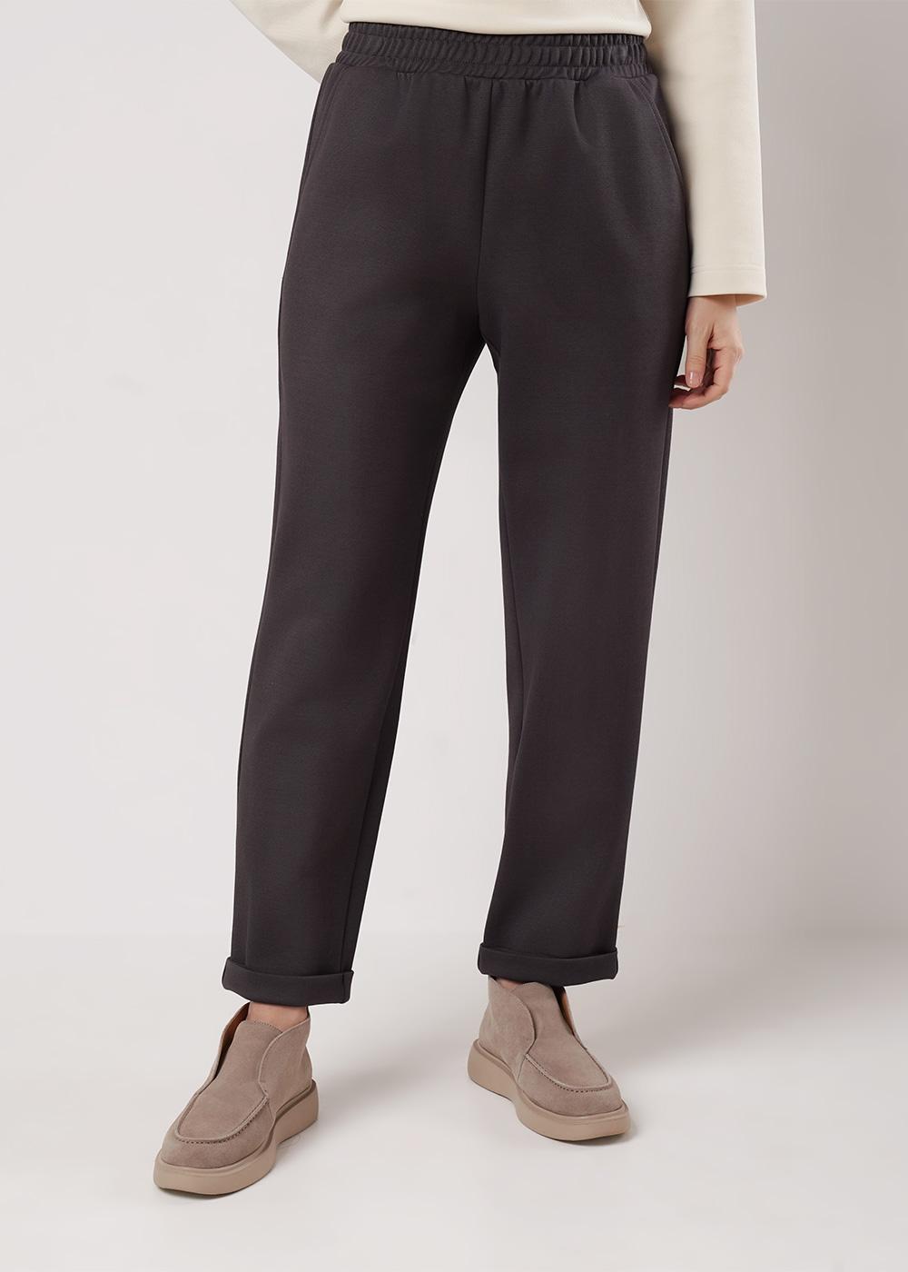 Брюки зауженные из трикотажного полотна плотное пике, умеренного объёма. Боковые карманы с отрезным бочком. Притачной пояс на внутренней резинке. По низу брюк отвороты.