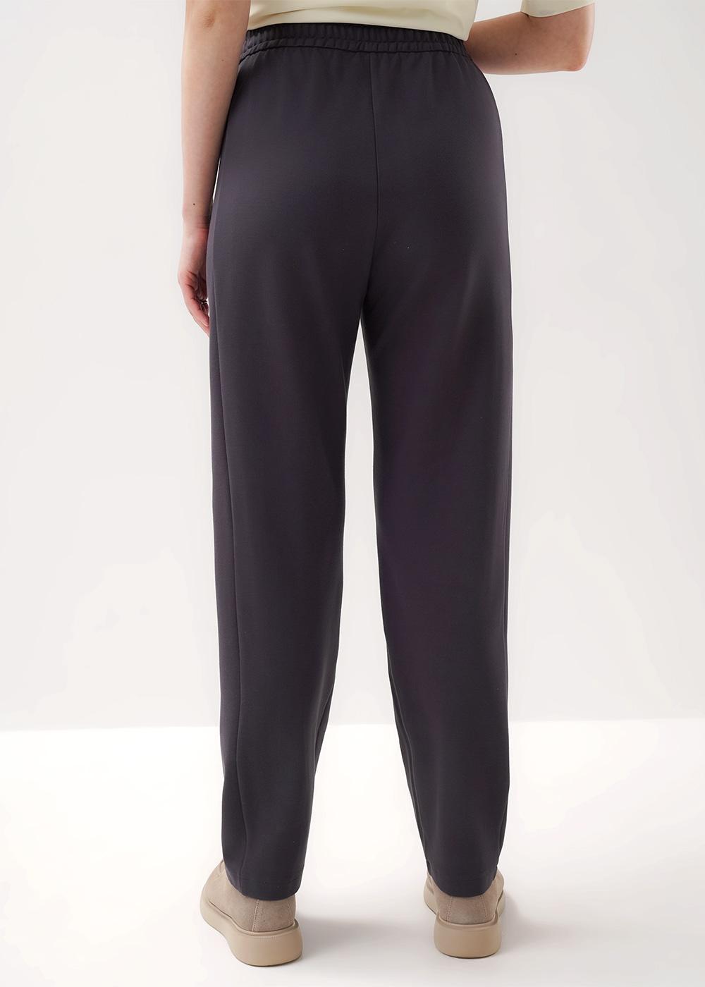 Брюки зауженные из трикотажного полотна дабл фейс. По талии притачной пояс с внутренней резинкой. Спереди имитация гульфика. По переду застроченный резы, боковые карманы в шве.