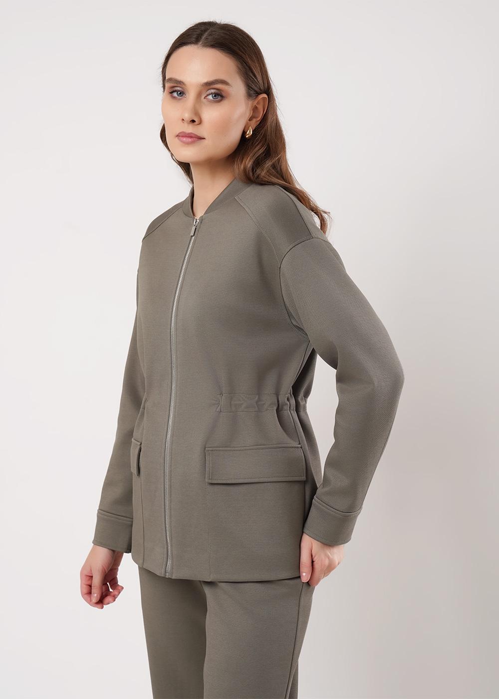 Куртка на молнии удлинённая из трикотажного полотна плотное пике. По горловине стойка. По переду и спинке кокетки. Рукав спущенный, внизу манжет. По талии внутренняя кулиса на резинке.Спереди накладные карманы с клапаном. По низу изделия потайной стежок.