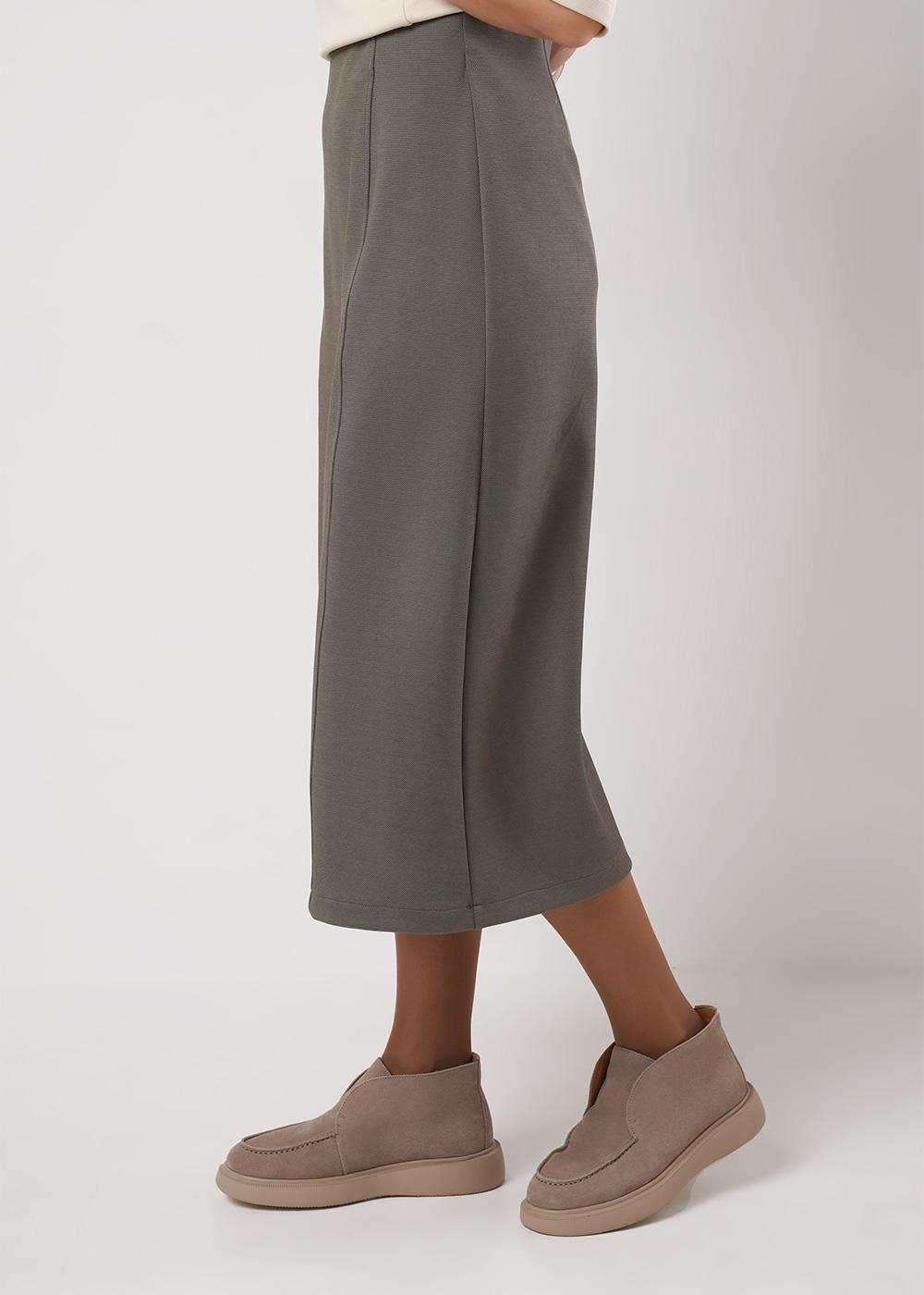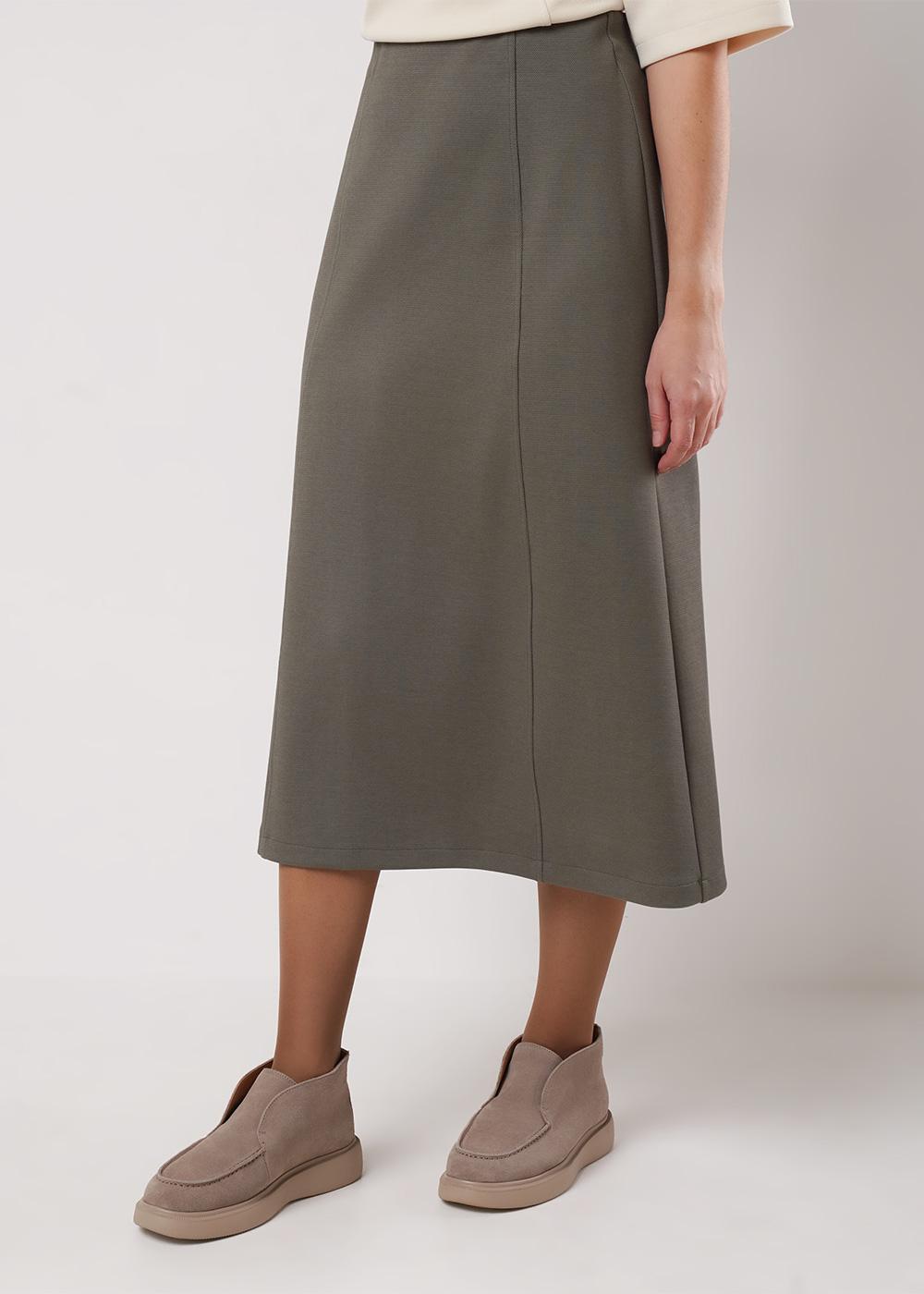 Юбка миди из трикотажного полотна плотное пике, А-образного силуэта. По талии внутренняя обтачка с резинкой. По переду рельефы. По спинке средний шов с молнией, вытачки.