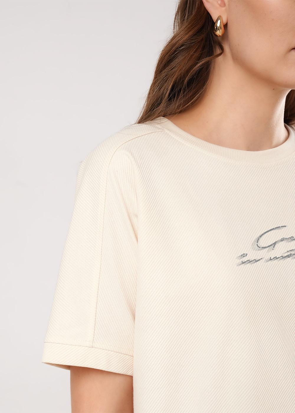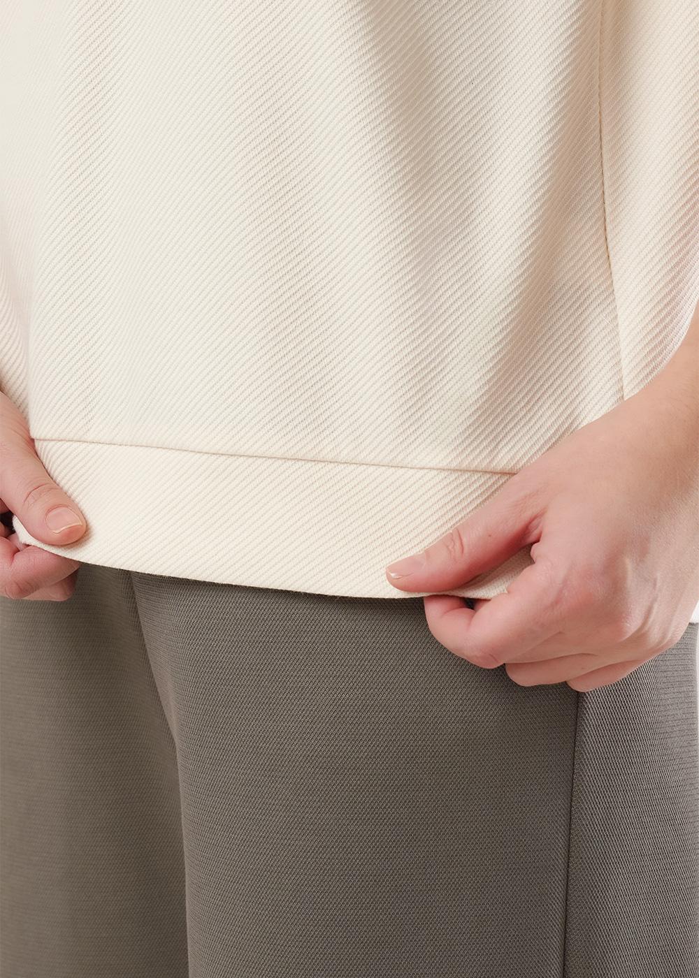 Джемпер свободного объема из трикотажного полотна. Округлая горловина с обтачкой из кашкорсе. Короткий цельнокроеный рукав, по низу манжет. По спинке кокетка со складкой. По низу изделия манжет. Спереди принт с вышивкой.