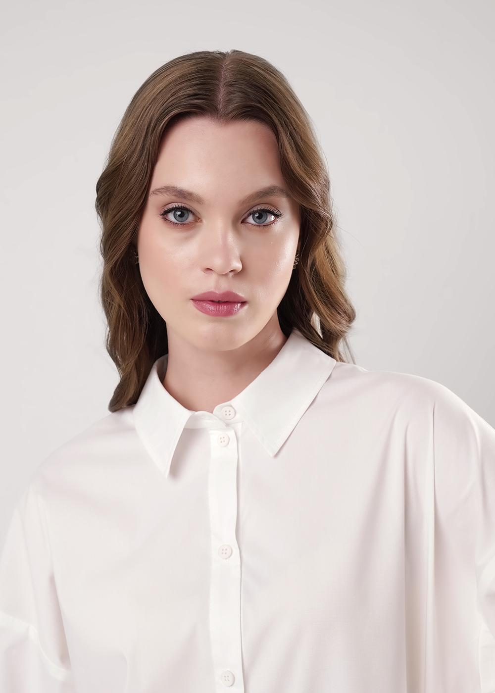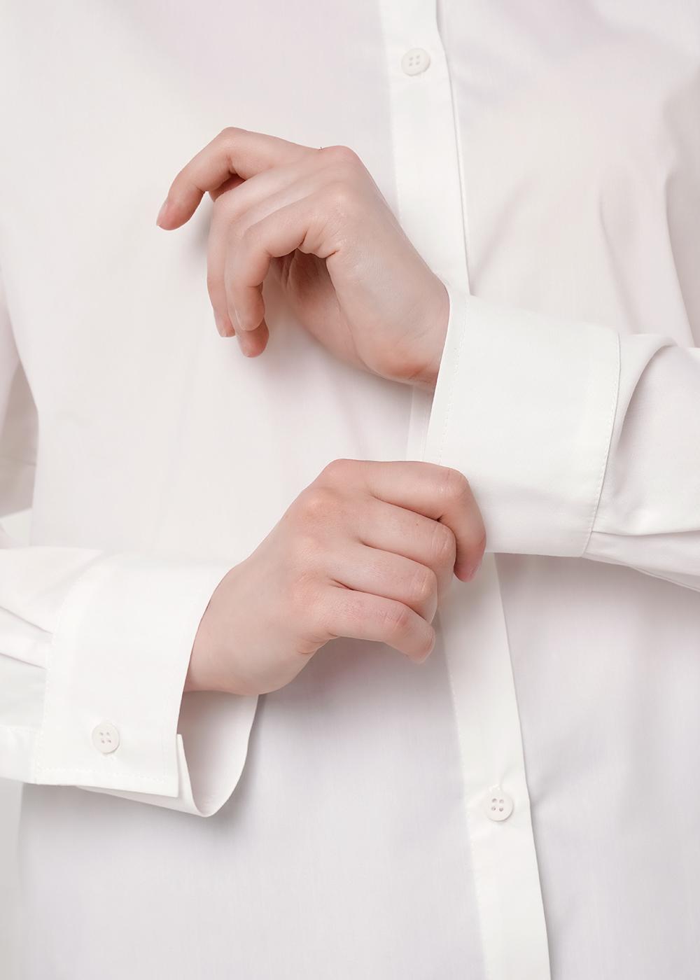 Блузка из текстильного полотна поплин,прямого силуэта на пуговицах с отложным воротником на стойке. По борту планка с пуговицами, по спинке кокетка со складками. Длинный рукав со спущенной линией плеча, внизу манжет с пуговицей. Низ изделия фигурный.