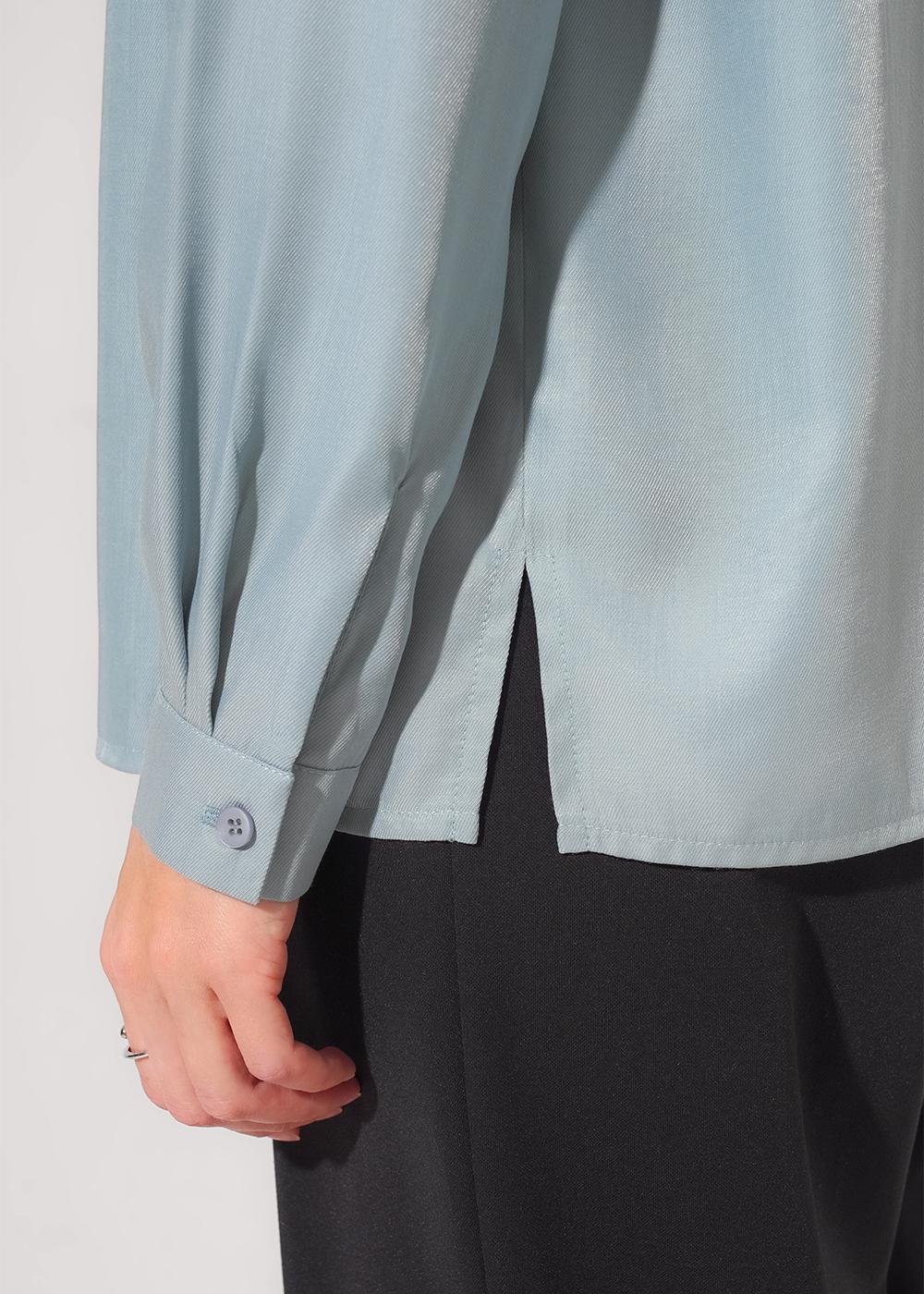 Блузка среднего объема из текстильного полотна штапель. Отложной воротник со стойкой. Цельнокроеная планка с застежкой на пуговицы. Втачной рукав, внизу притачной манжет с застежкой на пуговицу. Низ прямой, по бокам разрезы.